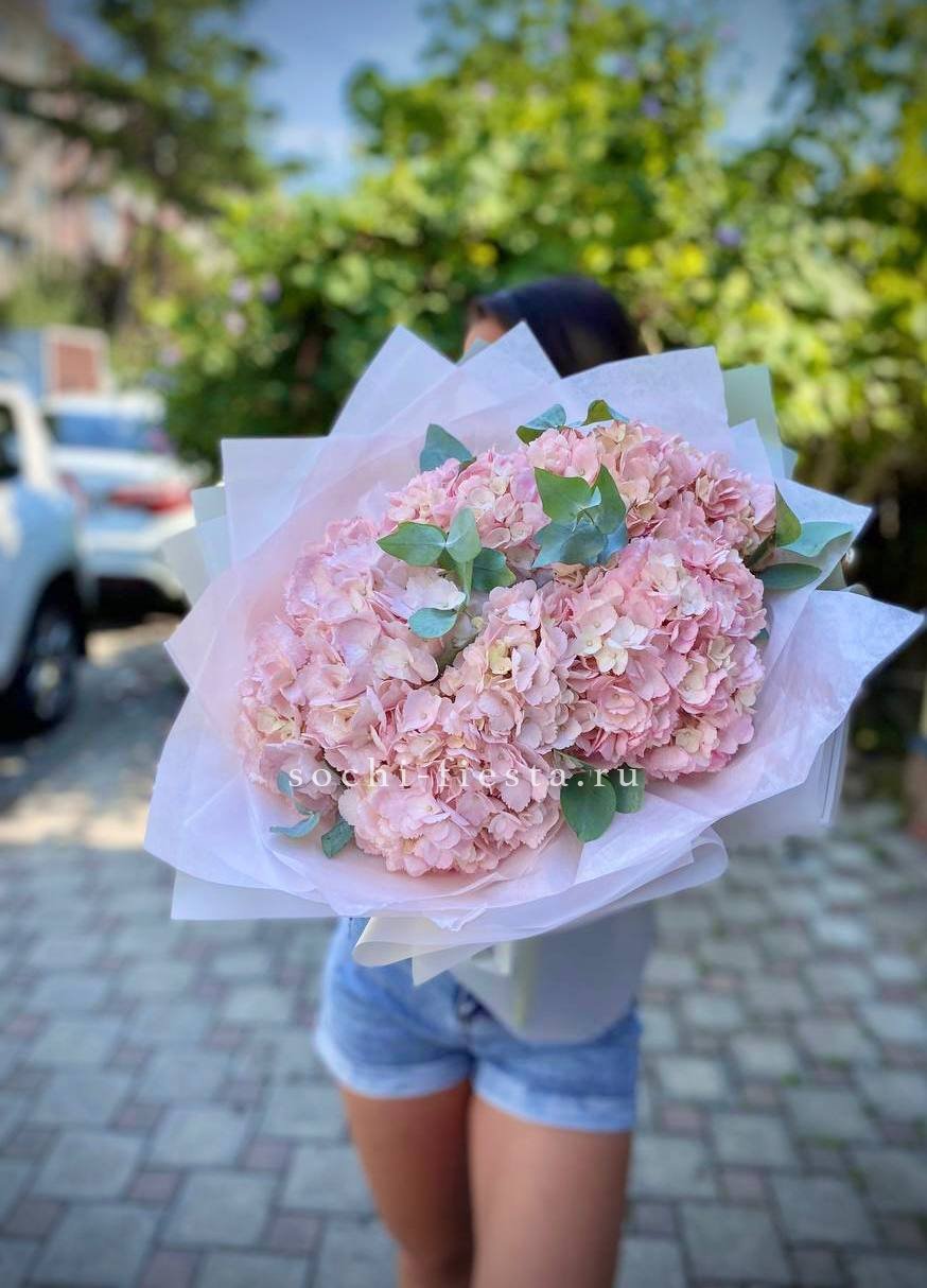 гортензия - 5 шт., эвкалипт,  лента, дизайнерская упаковка.