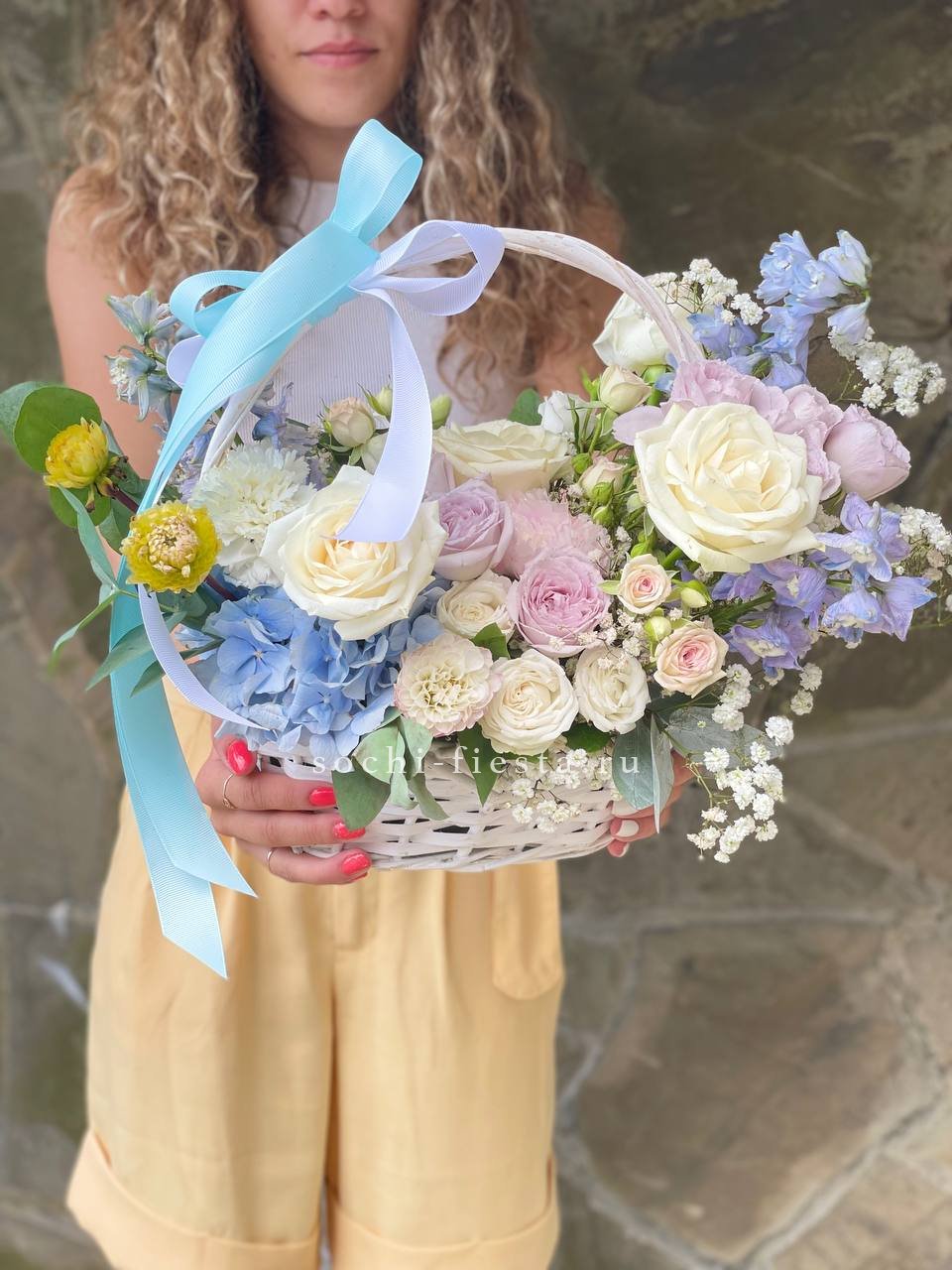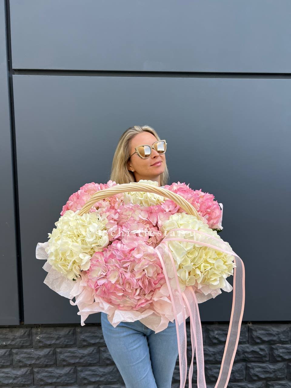 Семь гортензий в плетёной корзине держат форму и долго радуют свежестью. Компактная композиция удобна для размещения на столе или комоде без лишних хлопот.