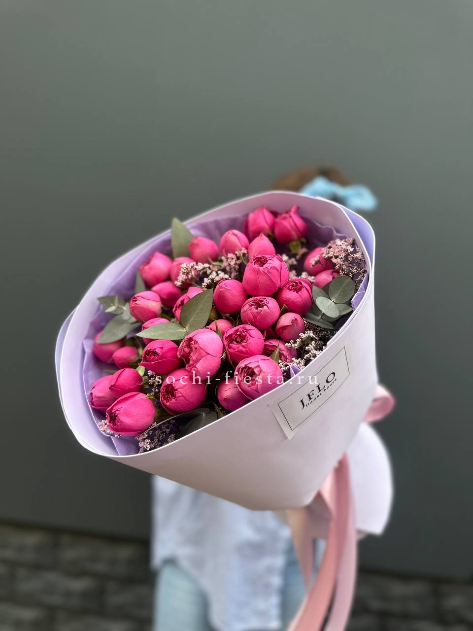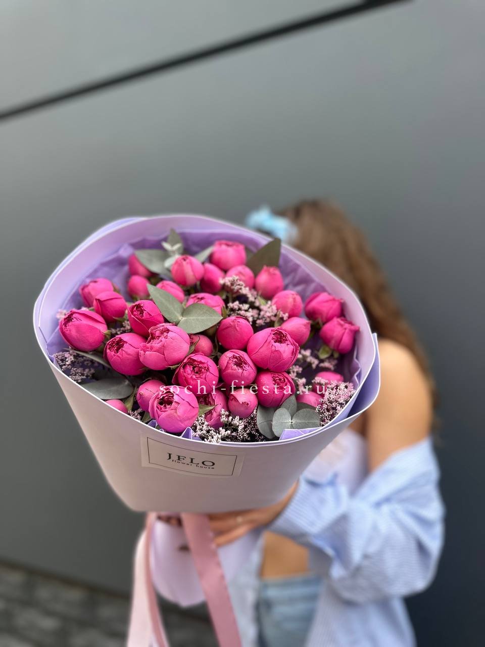 кустовые розы, эустома, хлопок, лента и дизайнерская пленка.