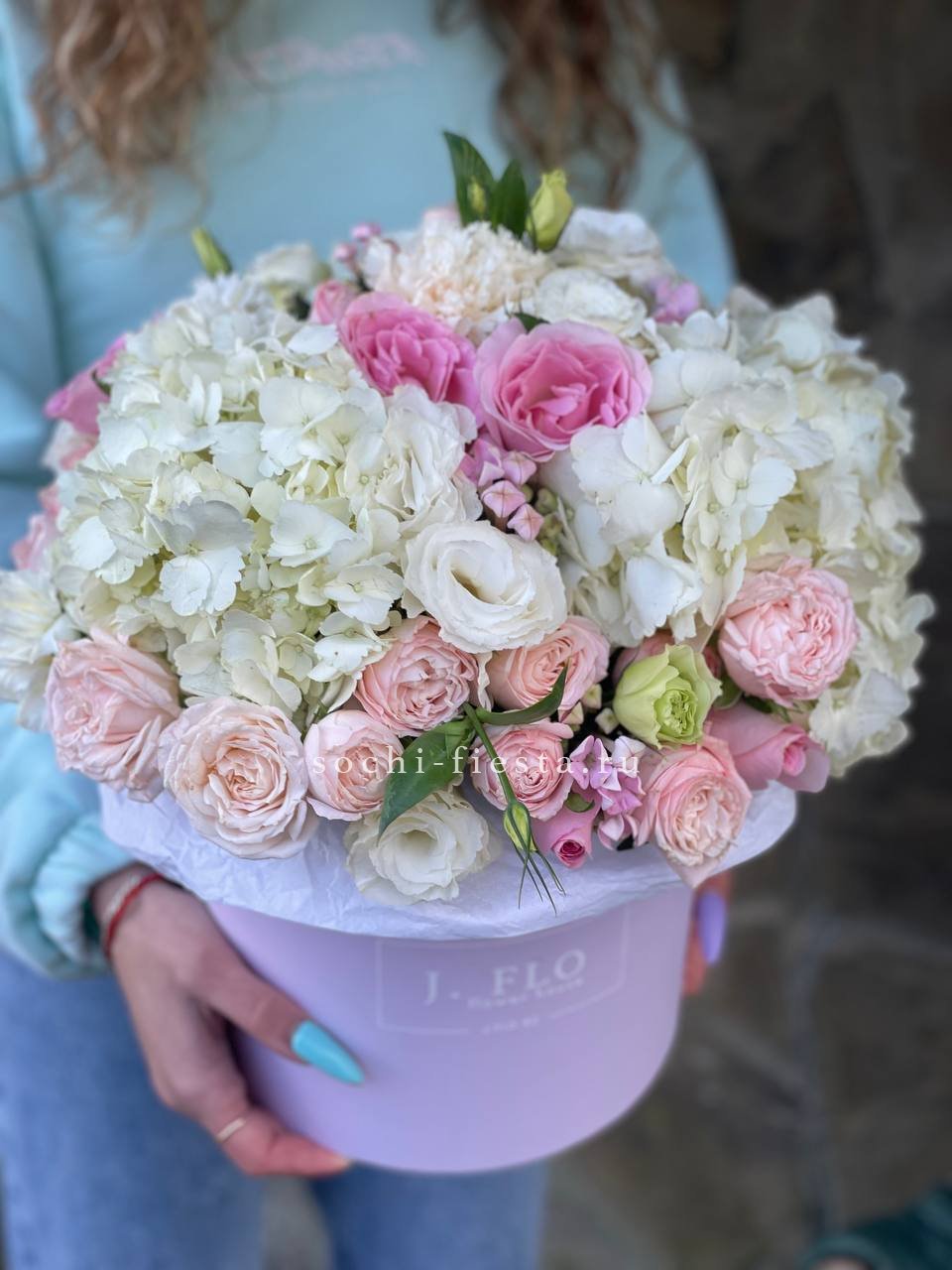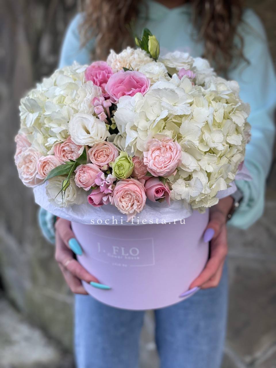 Пышные соцветия гортензии формируют плотное облако, которое занимает все пространство букета. Эустома добавляет воздушные акценты по краям композиции.