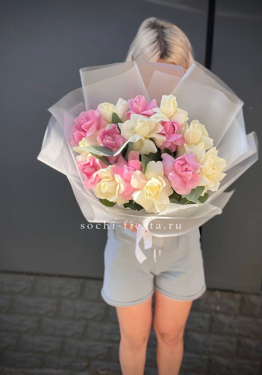 Этот пышный авторский букет в красно-розовых тонах представляет собой гармоничное сочетание страсти и нежности.