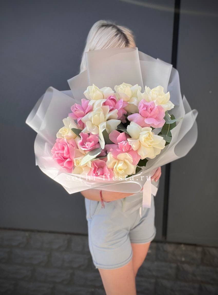 диантусы, эустома, красные розы, эвкалипт, пленка.