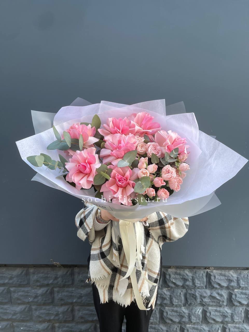 Розовая гамма раскрывается через махровые пионовидные бутоны и классические розы с плотной текстурой лепестков. Эвкалипт вплетается в композицию, создавая свежий акцент.