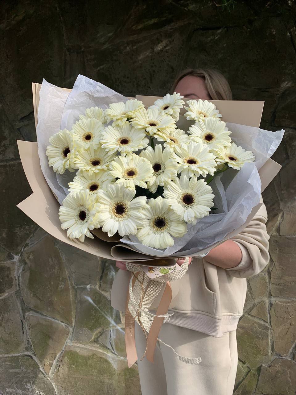 Герберы раскрываются широкими головками и складываются в яркую охапку с открытой подачей. Цветные лепестки располагаются на одной высоте и образуют ритмичный рисунок.