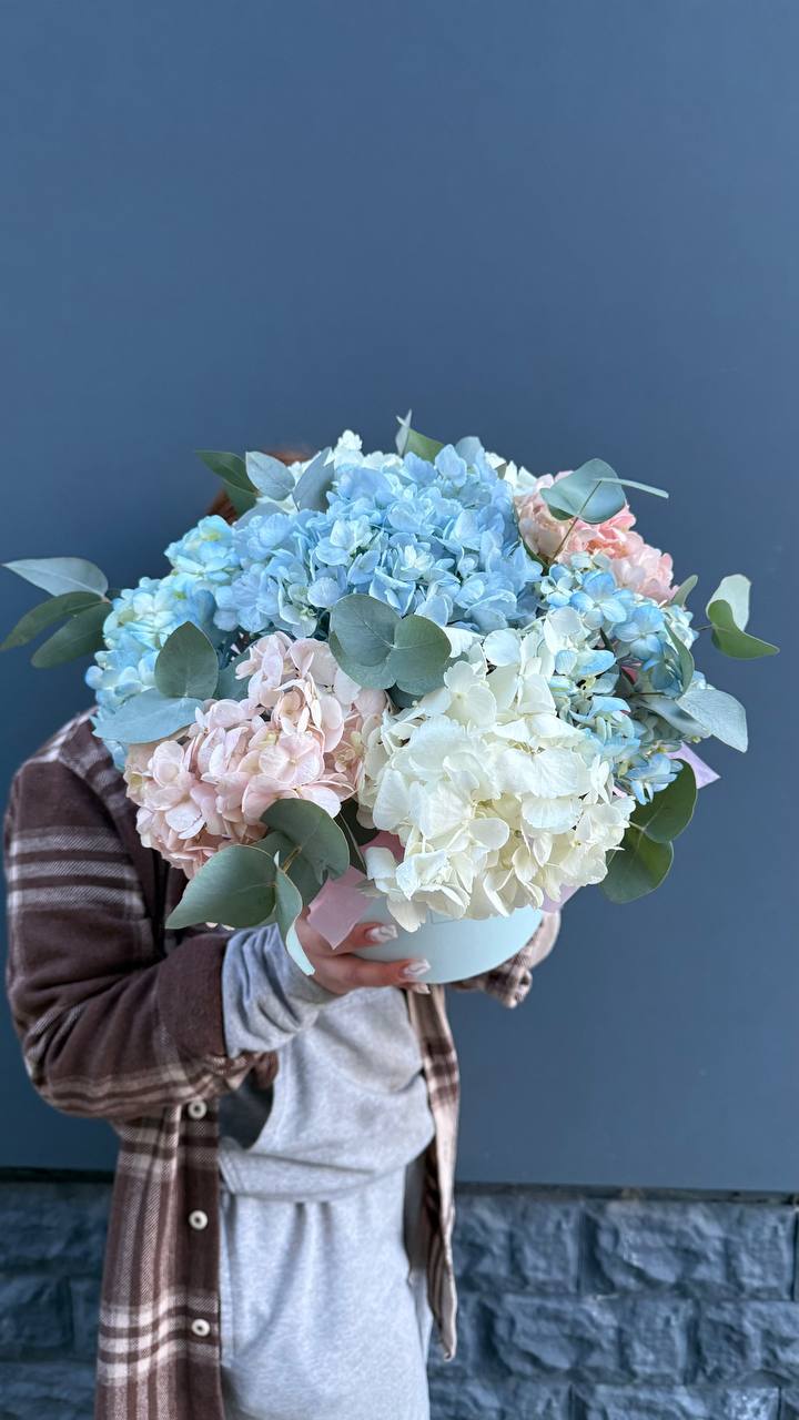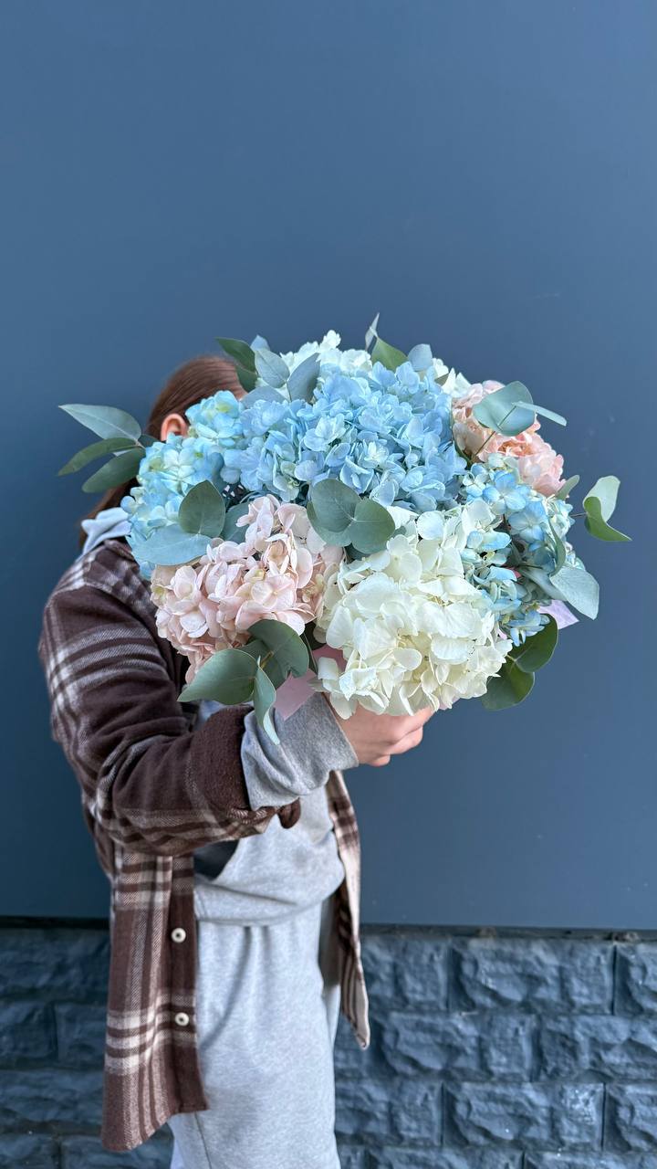 Пышные шапки розовой гортензии собраны в объёмную охапку, где каждое соцветие создаёт мягкую фактурную волну. Оттенок варьируется от пудрового до насыщенного ягодного, формируя живописную глубину.