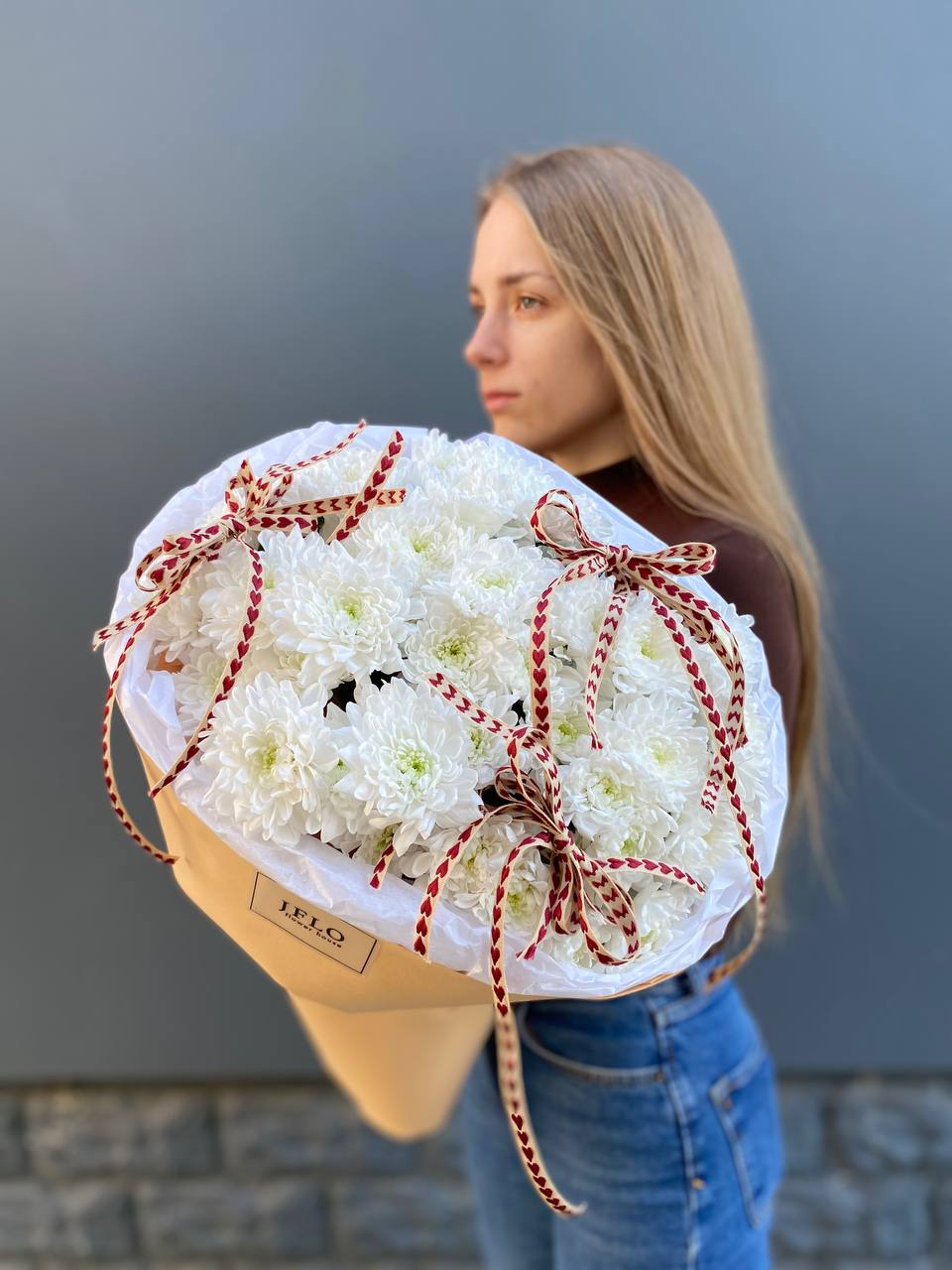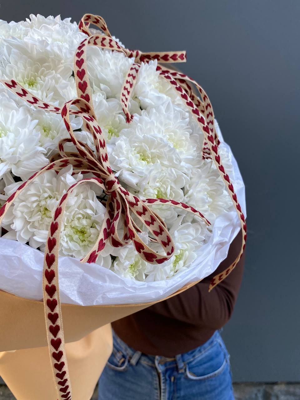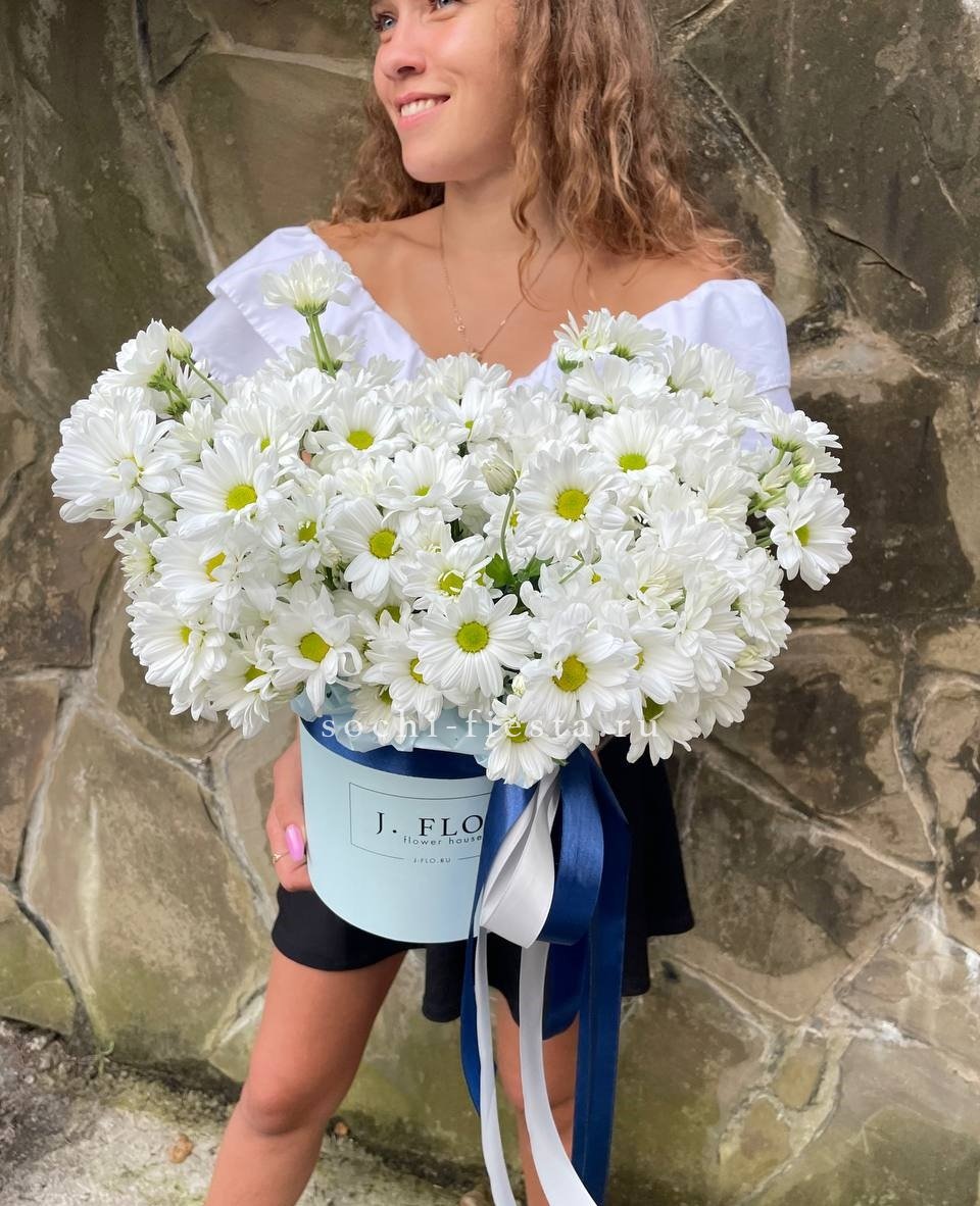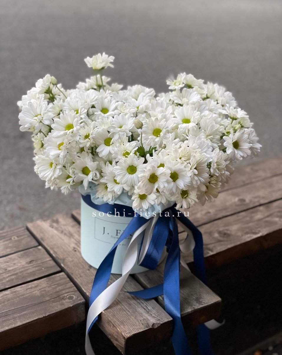 Девять кустовых хризантем собраны в плотный круглый силуэт. Каждая ветка раскрывается веером мелких соцветий, создавая объёмную текстуру. Букет держит форму и выглядит графично.