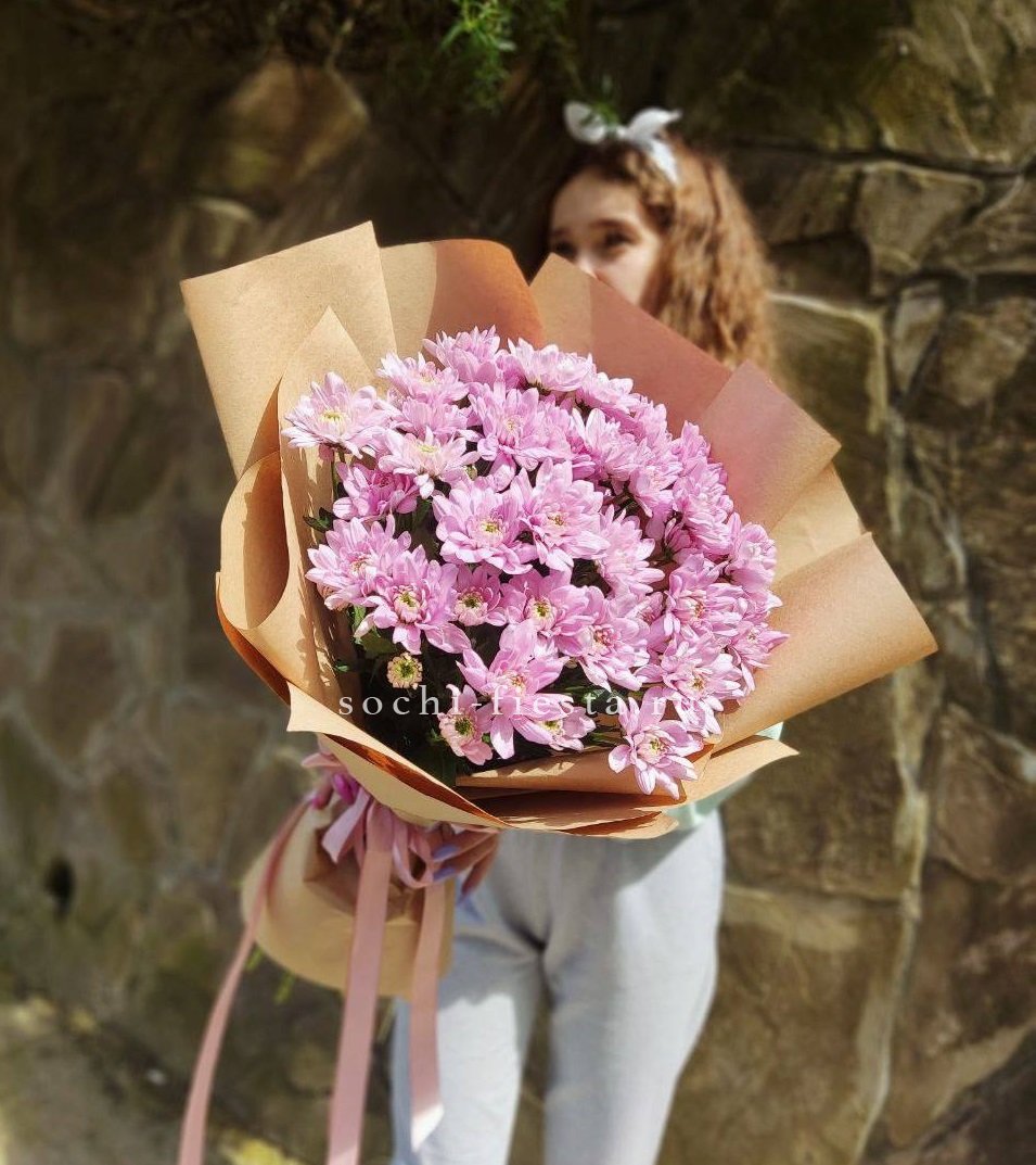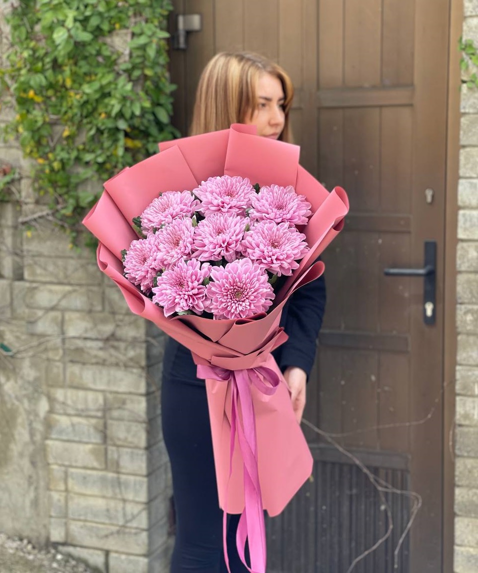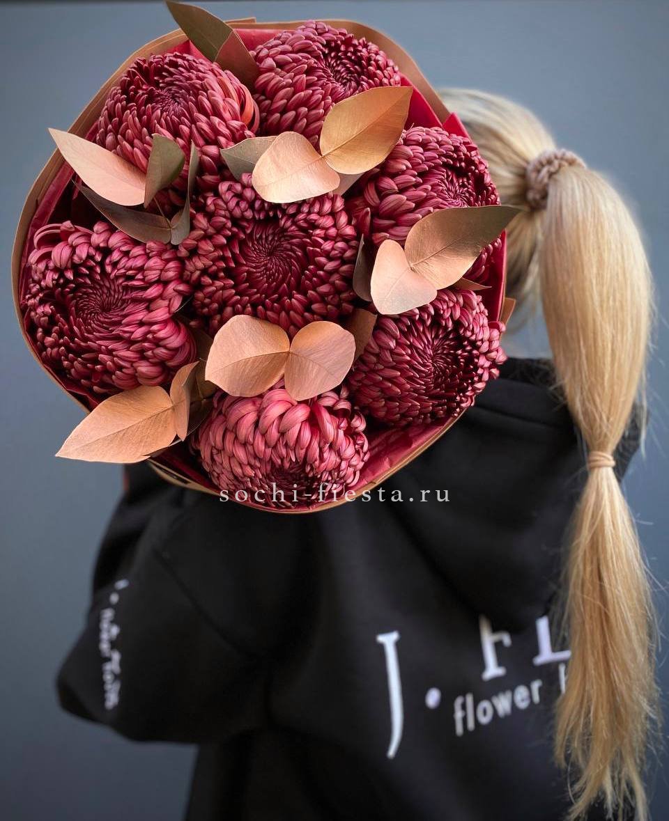 хризантемы - 7 шт, эвкалипт,  лента, дизайнерская упаковка.