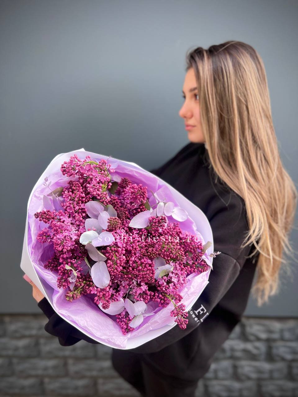 Девять веток сирени образуют воздушную форму с мягким силуэтом. Соцветия располагаются свободно, создавая ритм без строгой геометрии. Композиция легко вписывается в любое пространство, сохраняя естественную красоту весеннего цветения.