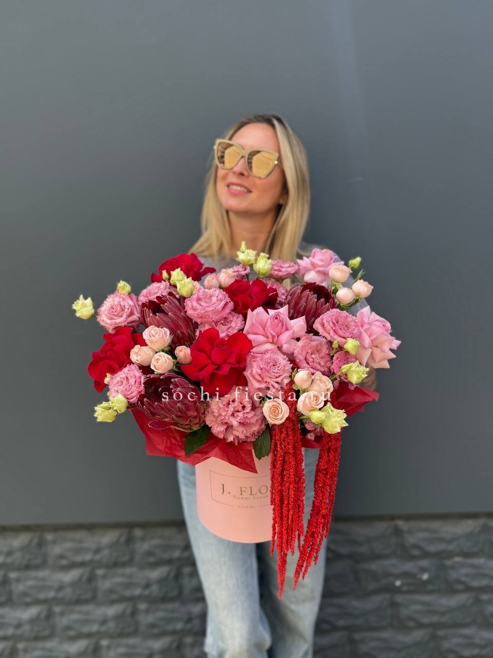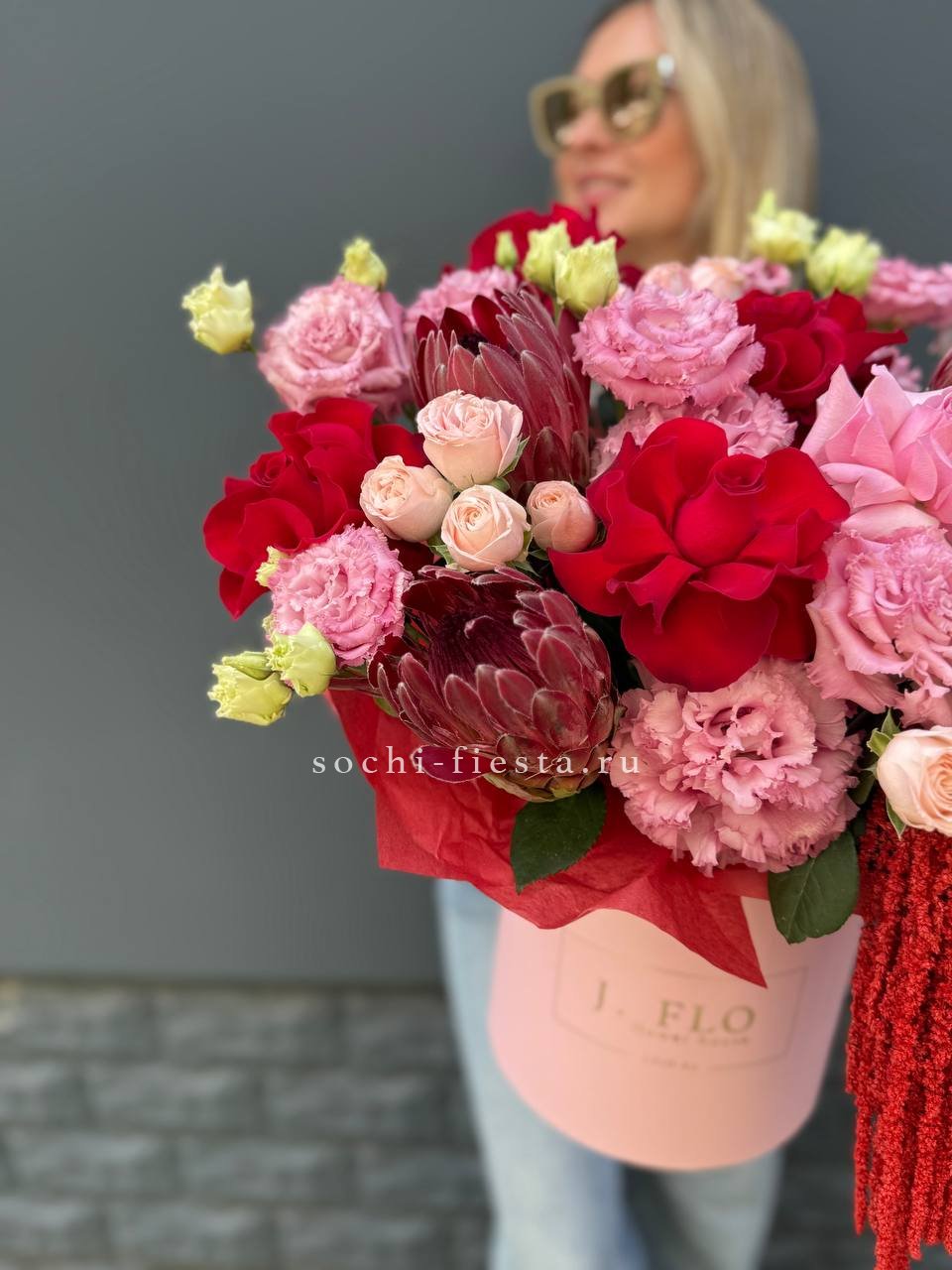 Протея с её графичными соцветиями задаёт ритм всей композиции. Амарант свисает мягкими нитями, эустома добавляет воздуха, а кустовые розы собирают форму в плотный цилиндр.