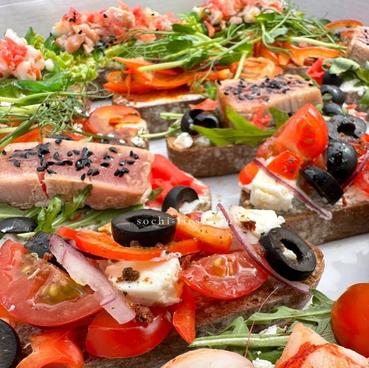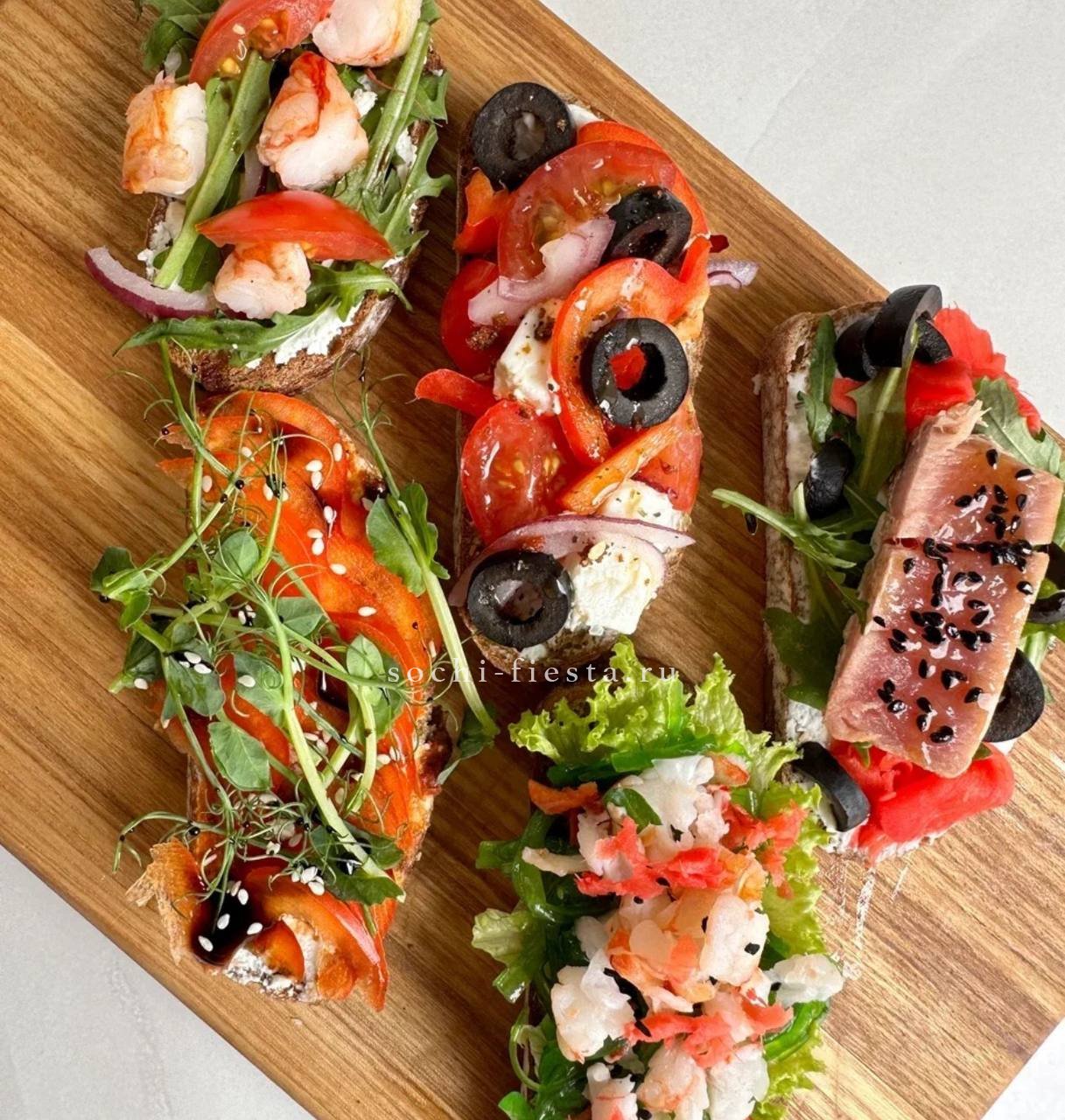 Шестнадцать брускетт с мясными и рыбными начинками. Говядина с вялеными томатами, паштет из печени, семга с огурцом и карбонад с черри раскрывают богатство вкусов в одной подаче.