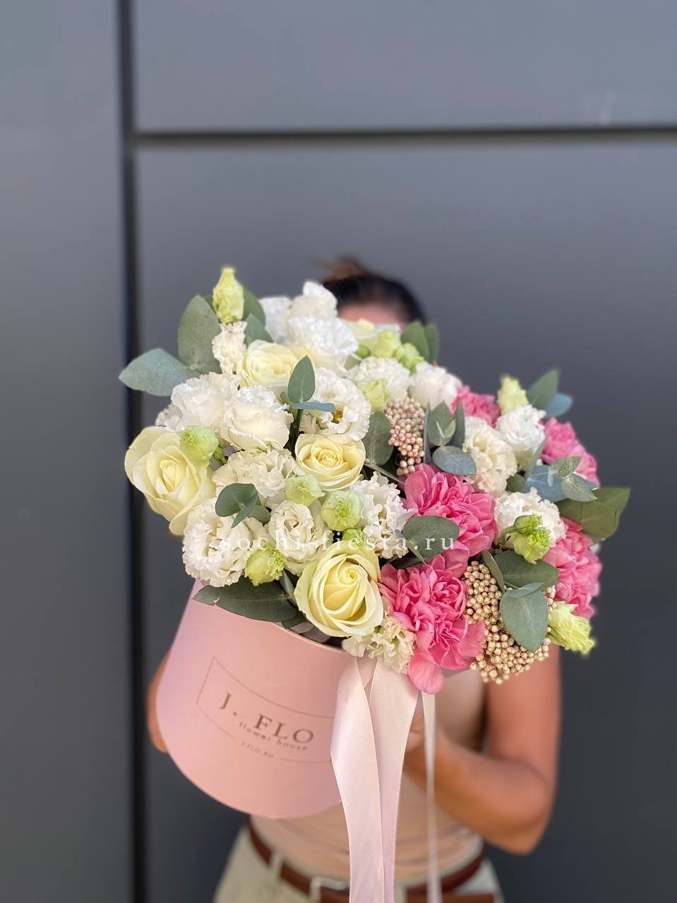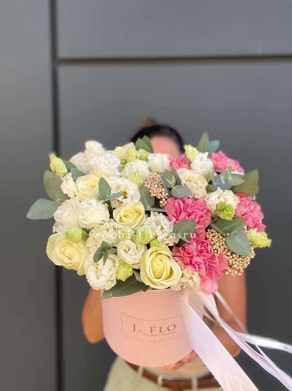 бокс 16, гортензия, роза, эустома, лилия, статица, лагурус.