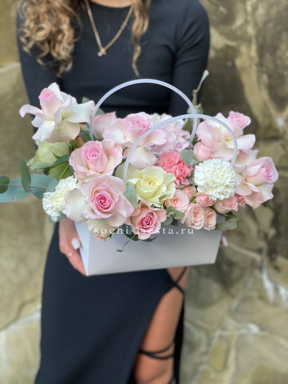 Белоснежные розы и воздушная эустома соседствуют с пышной гортензией и яркими вспышками статицы. Композиция собрана плотно, каждый цветок находит своё место в общем ритме.