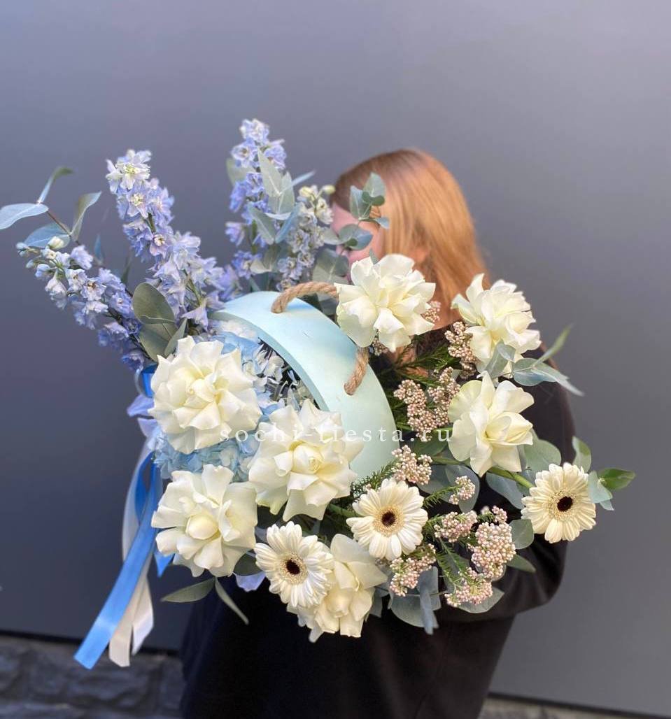 Белые розы и герберы выстраивают светлую основу, а синий дельфиниум задаёт вертикальный ритм всей композиции. Гортензия и озотамнус заполняют пространство между крупными бутонами.