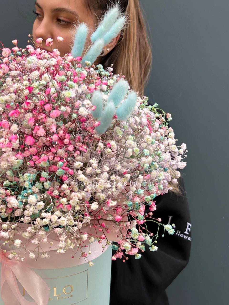 9 Радужных гипсофилы в шляпной коробке