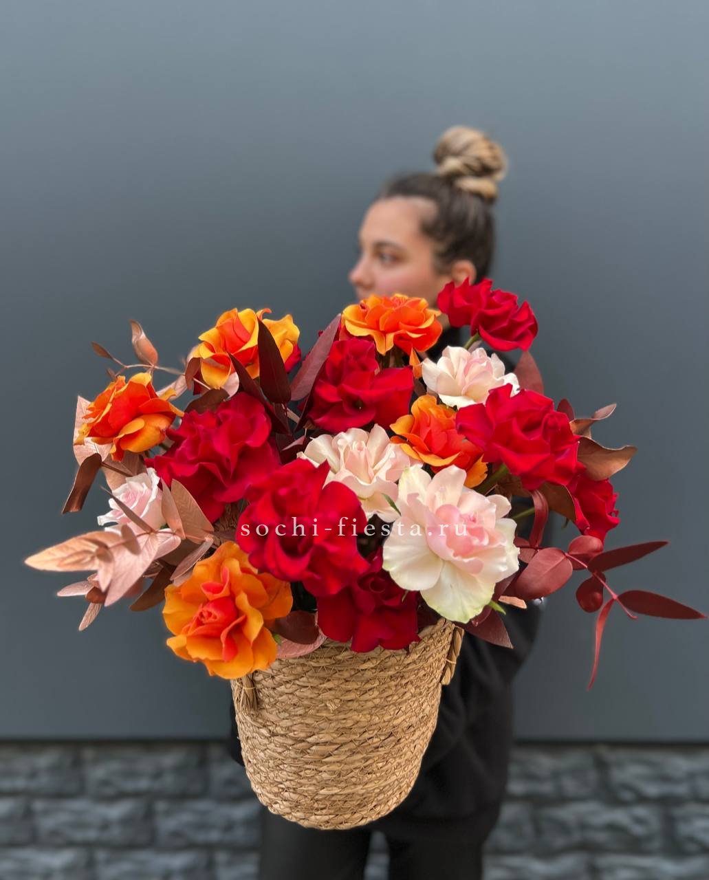 Французские розы собраны в плотную округлую форму и дополнены серебристыми ветками эвкалипта. Натуральное джутовое кашпо придает композиции естественность и законченность.