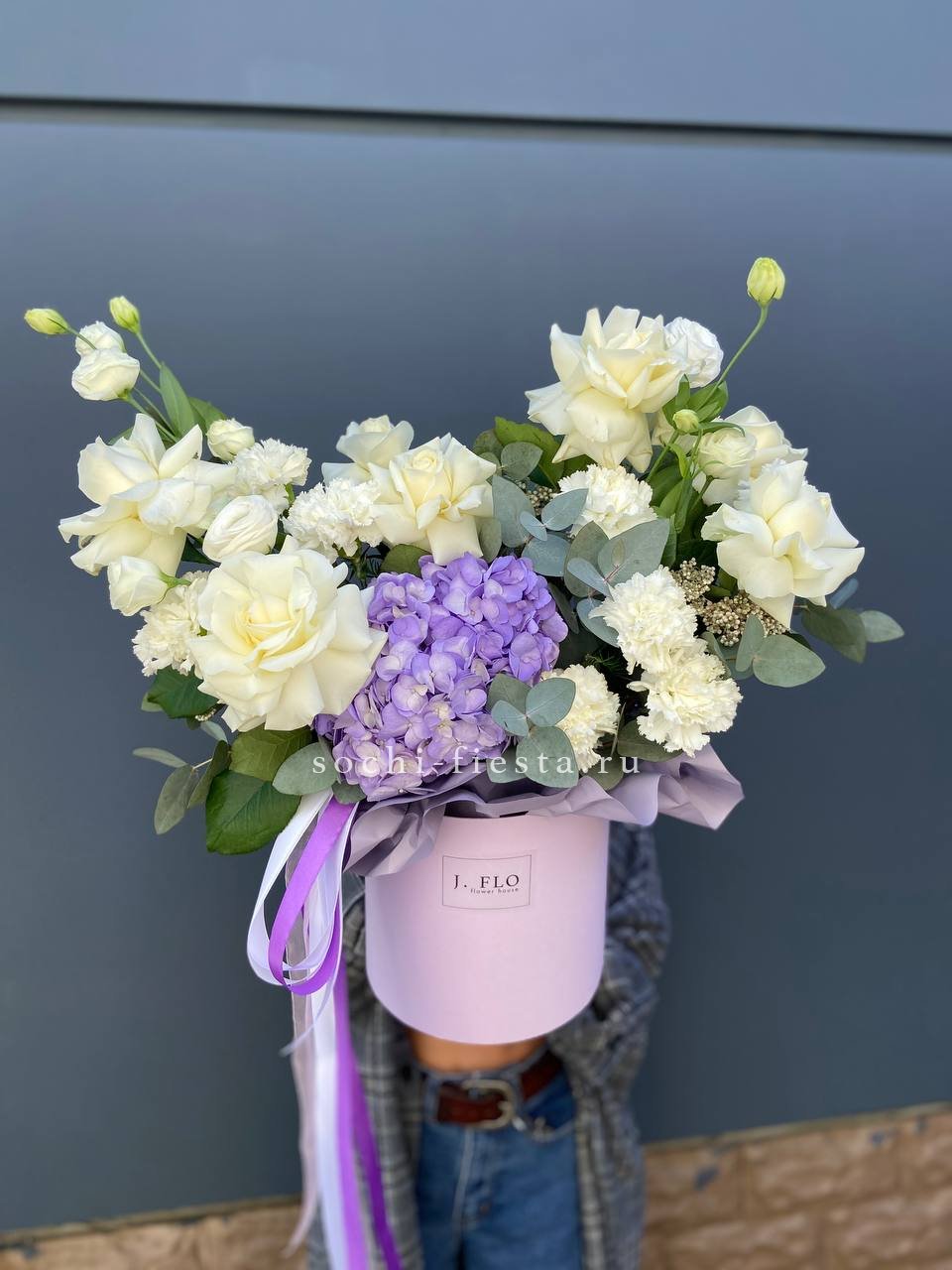 вывернутые белые розы, диантус, эустома, гортензия, цилиндр, эвкалипт, лента, упаковка.