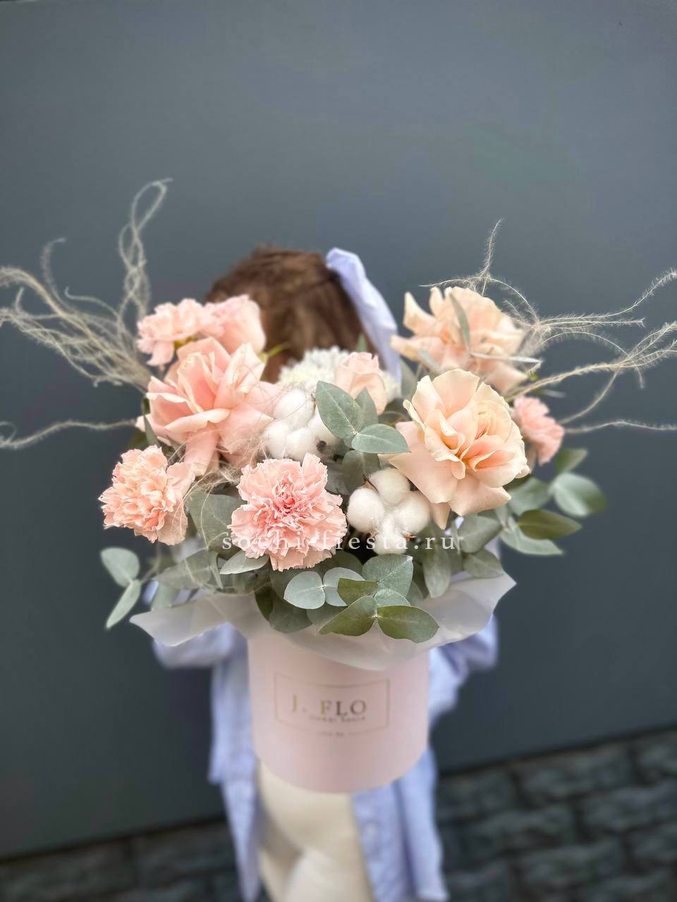 гортензии, эустома, розы, бомбастик, эвкалипт, антиринум в боксе 25.