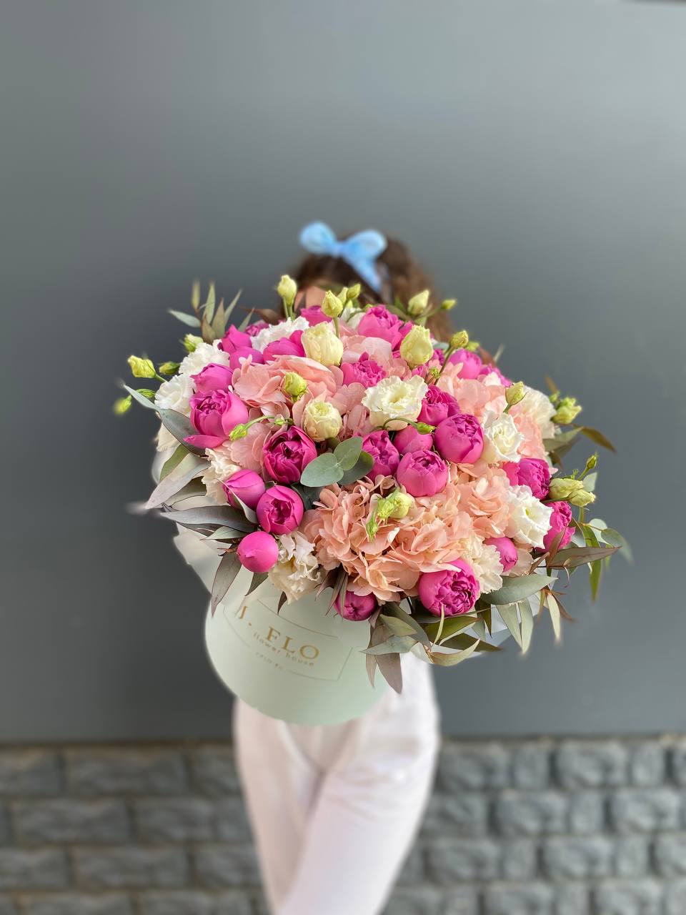 Редкий сорт Мисти Бабблс наполняет композицию глубокими оттенками и крупными бутонами. Эвкалипт оттеняет пионовидные розы, создавая завершенный образ в просторной упаковке.