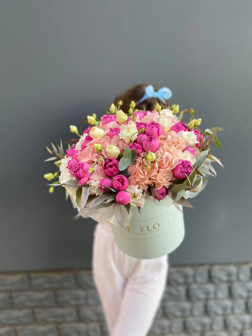 пионовидная роза сорта Мисти бабблс, эвкалипт в коробке или корзине.