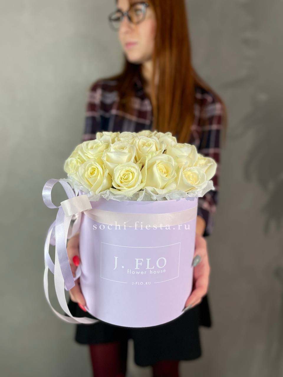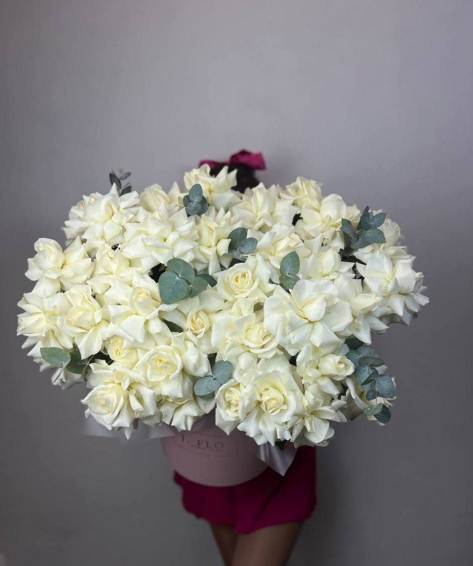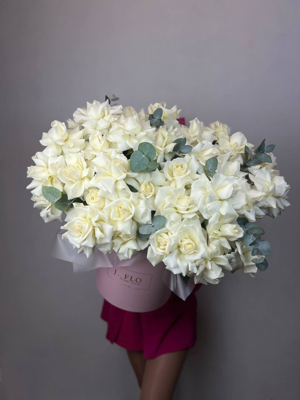 Двадцать пять белых роз выстроены ровными рядами, образуя безупречный круг. Минималистичная подача в цилиндре подчёркивает графичность и строгость линий.