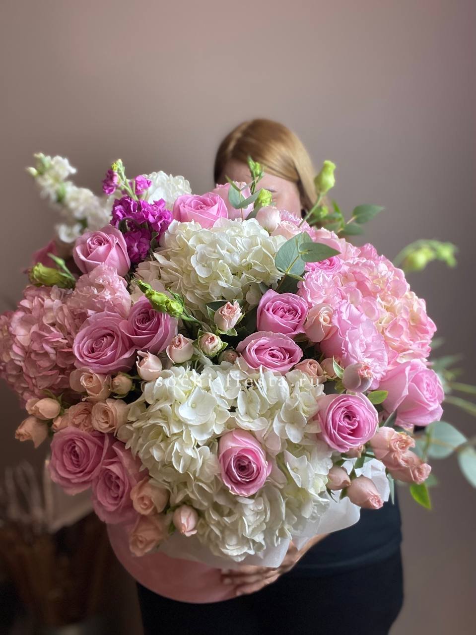 Объемная композиция занимает пространство уверенно и выразительно. Розово-белая гамма плавно перетекает от одного оттенка к другому. Крупный формат позволяет раскрыть всю красоту каждого цветка.