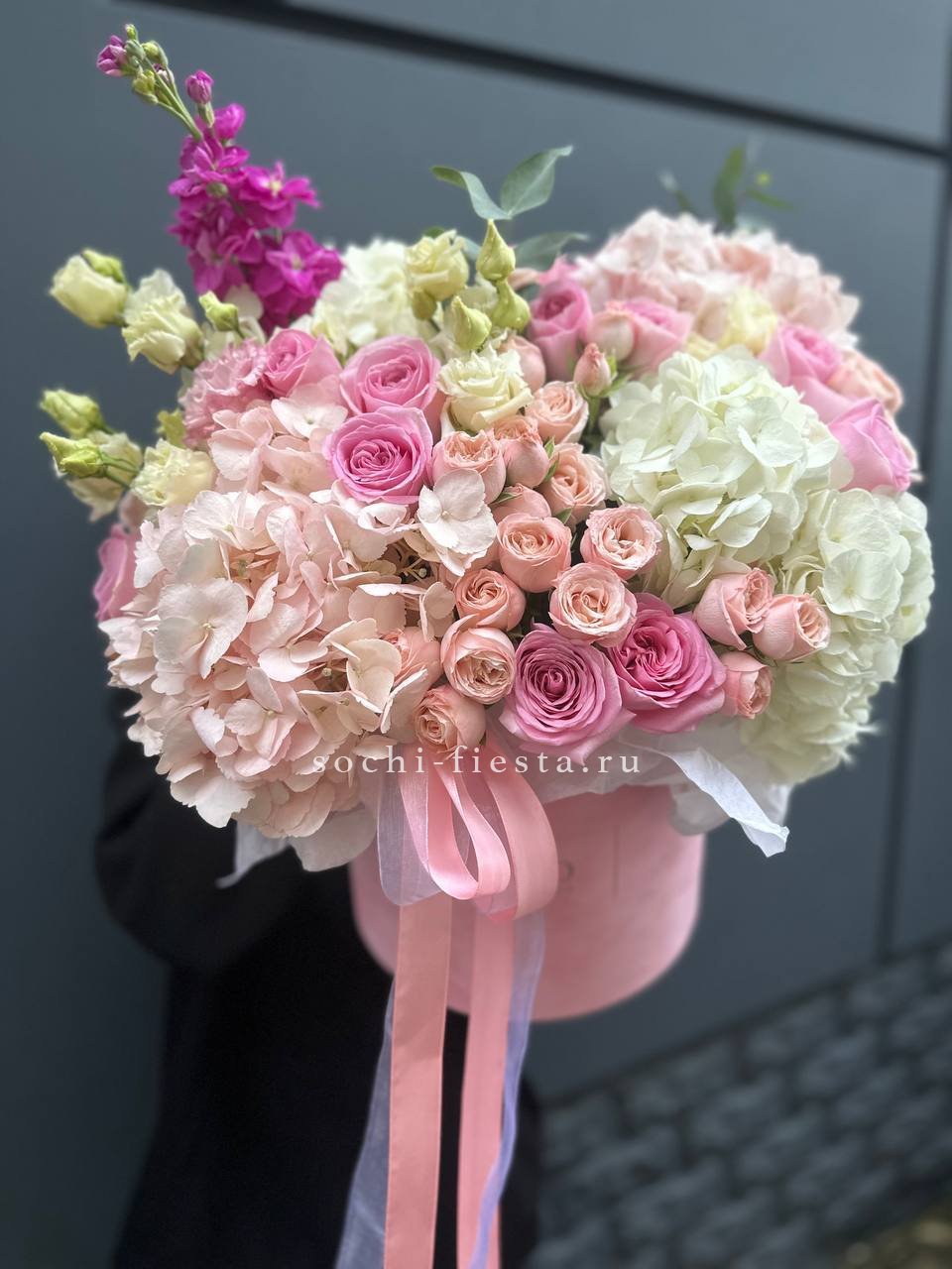 цветочная композиция в розово-белых тонах в розовом цилиндре D20-25.