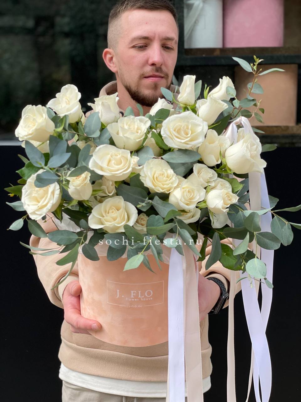 пионовидная кустовая роза, хлопок, одноголовая роза, кустовая хризантема, ковыль(стифа), эвкалипт, бокс D25.