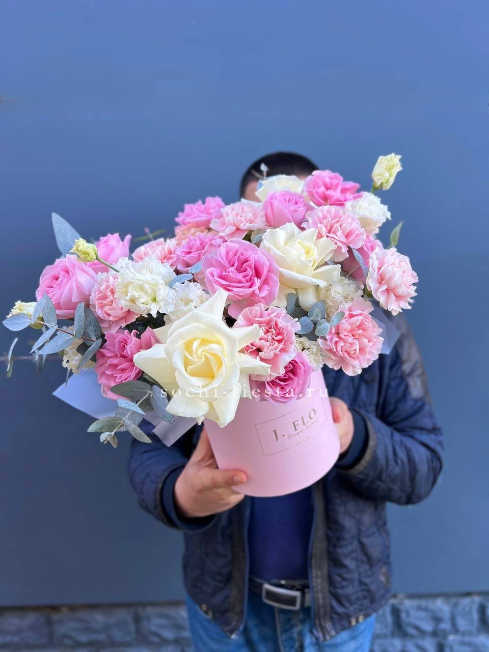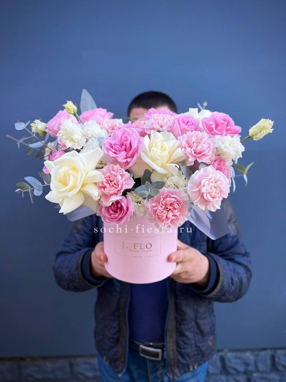 Пионовидные розы Мисти Баблс и экзотичные орхидеи Цимбидиум создают композицию с мягкими переходами оттенков. Цилиндрическая форма собирает цветы в плотную структуру с выразительным силуэтом.