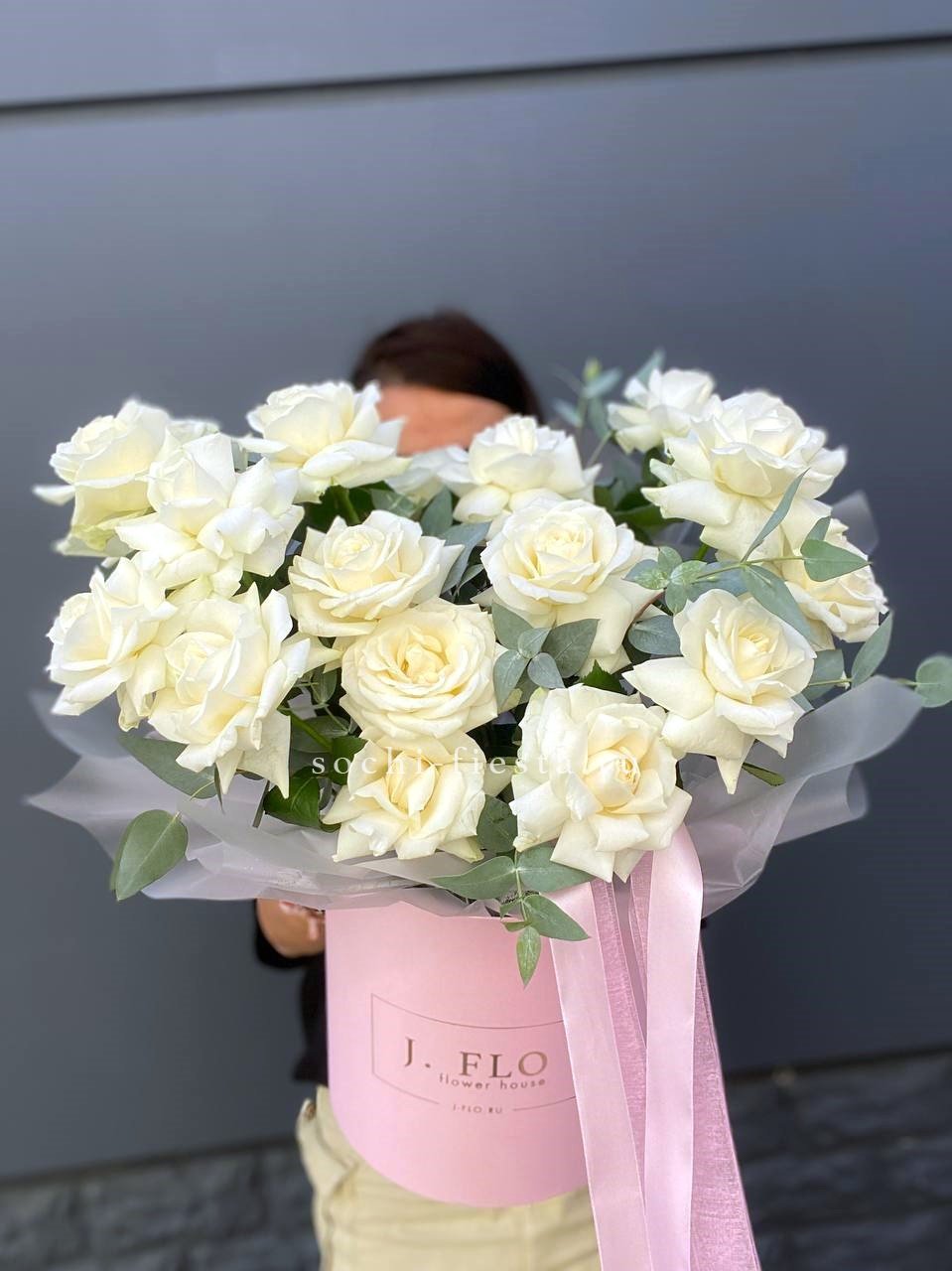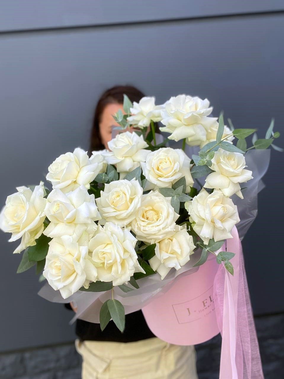 Пионовидные кустовые розы формируют плотный купол с мягкими переходами оттенков. Каждый бутон раскрывается слоями, создавая объёмную текстуру. Эвкалипт добавляет свежести композиции в цилиндре.
