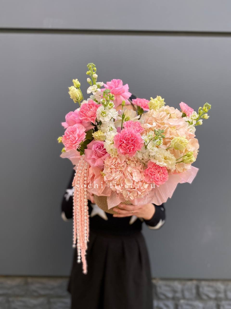 маттиола, французские розы, кустовые пионовидные розы, дианутсы, амарантус.