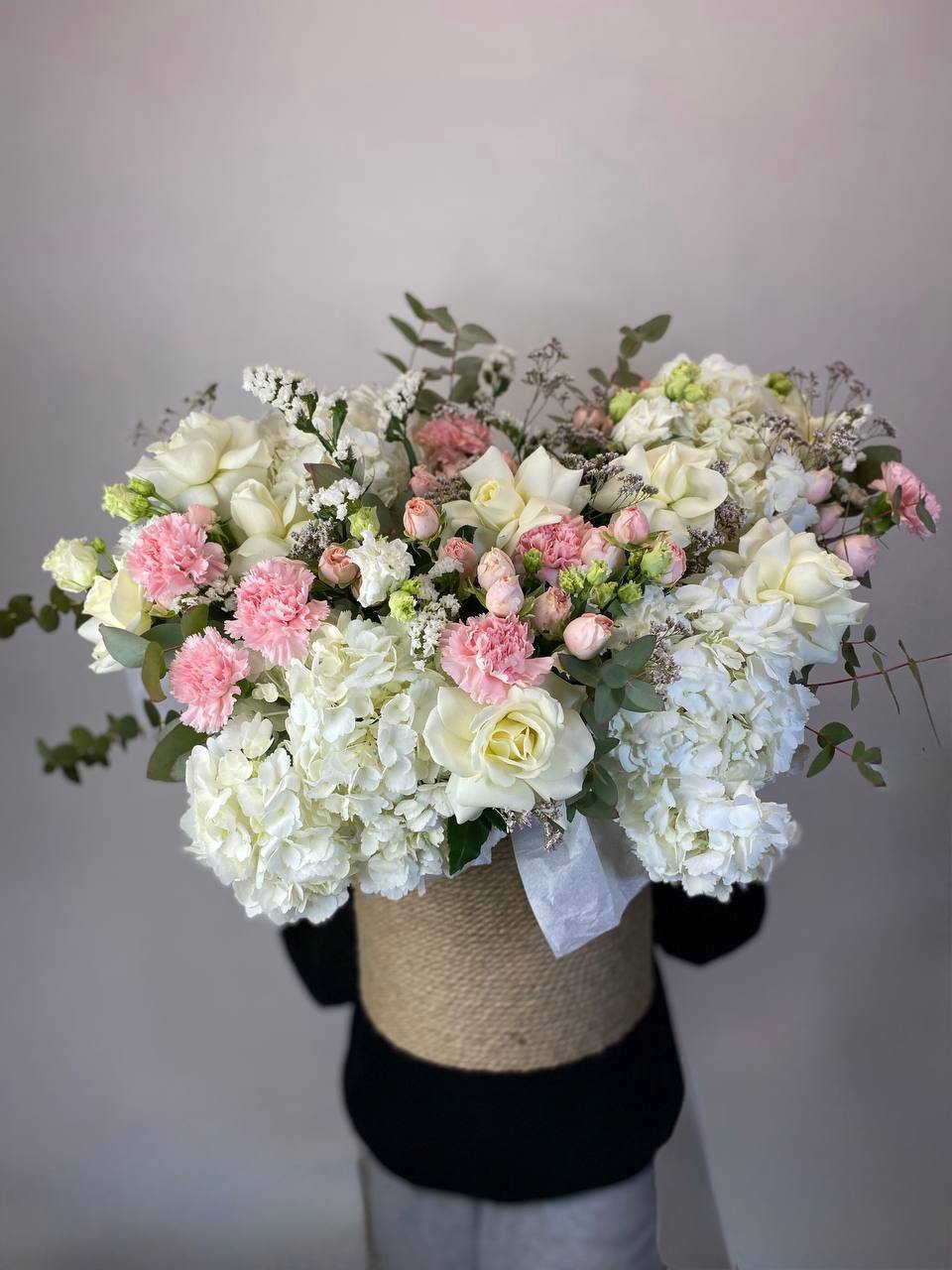 красная роза, бомбастик, лагурус, золотой эвкалипт, джутовое кашпо.