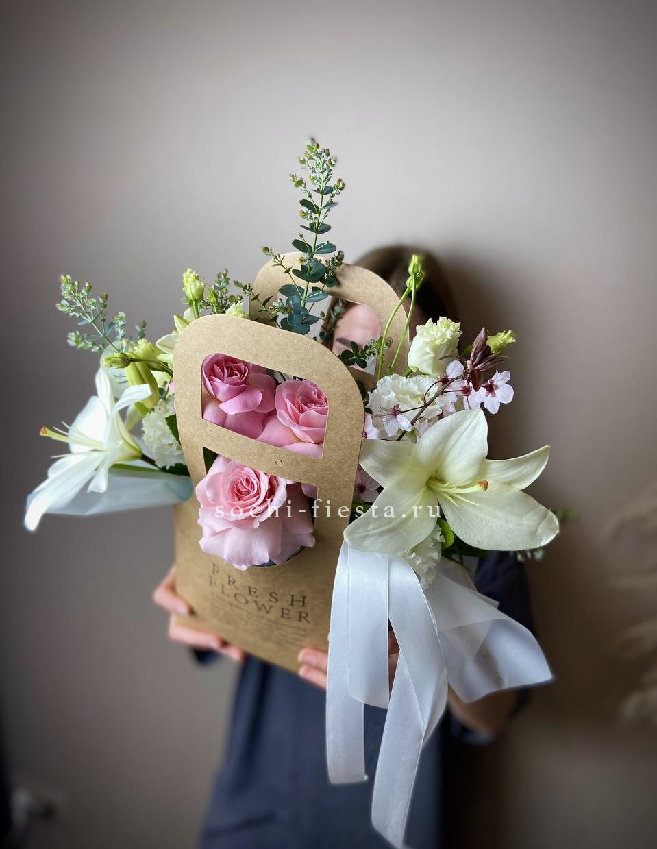 Белоснежные розы переплетаются с воздушной эустомой и раскрытыми лилиями в аккуратной цветочной сумке. Эвкалипт создаёт прохладный фон для светлых бутонов. Композиция на оазисе сохраняет свежесть и форму долгое время.