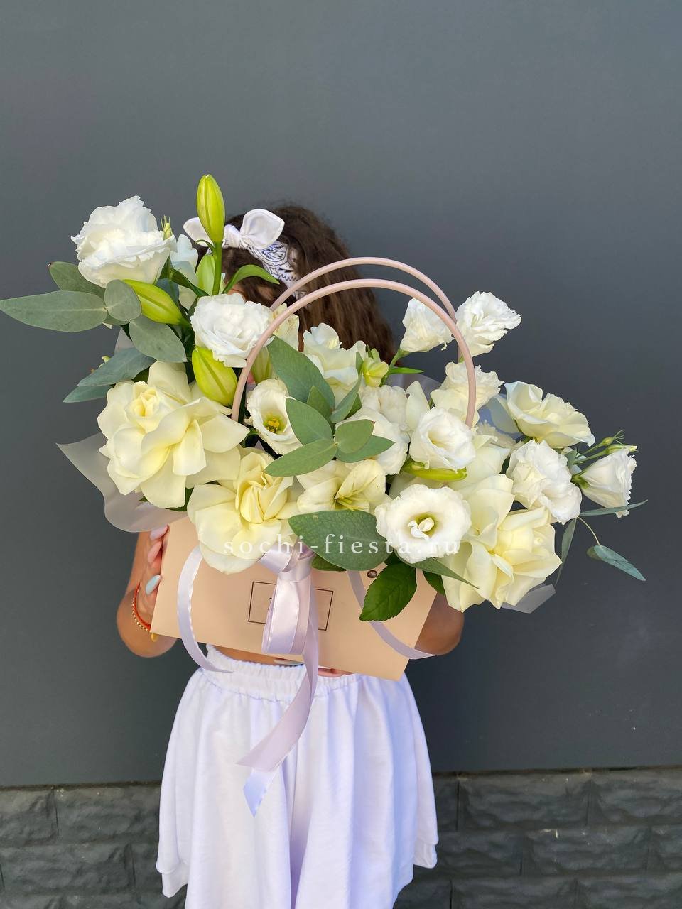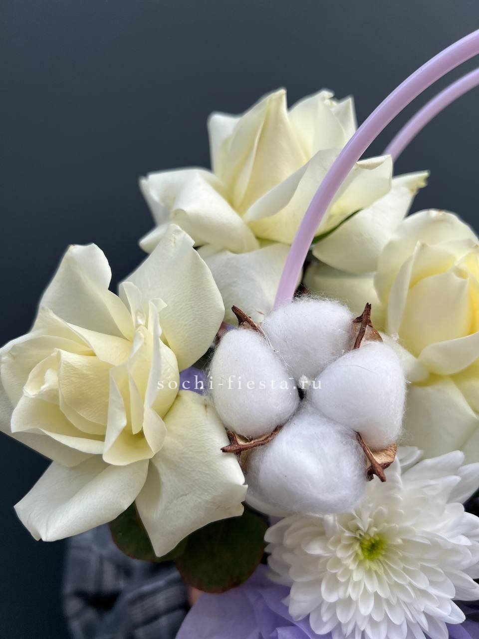 Белые и розовые розы образуют воздушную композицию с мягкими коробочками хлопка и лимониумом. Сумка-кашпо Sofi держит форму и позволяет разместить цветы на столе или полке. Букет выглядит аккуратно и остается свежим долгое время.