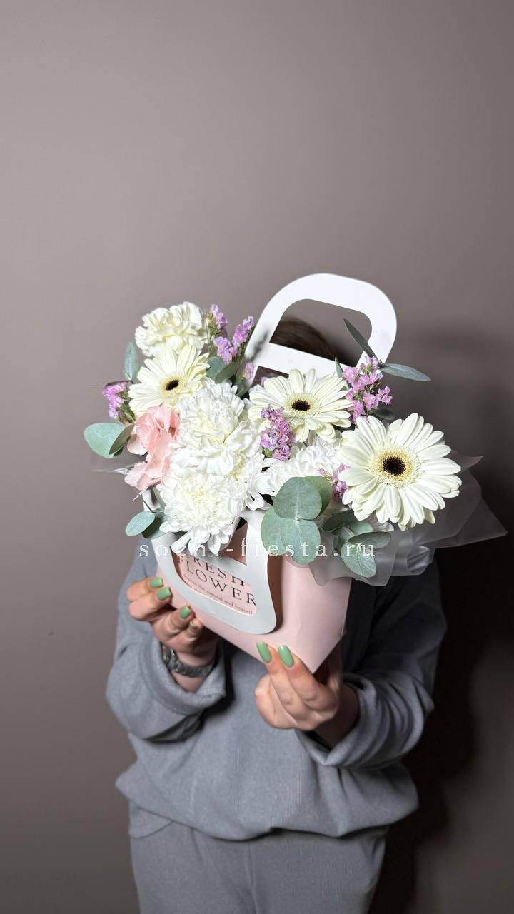 гербера, хризантема, диантус, статица, гортензия, сумочка.