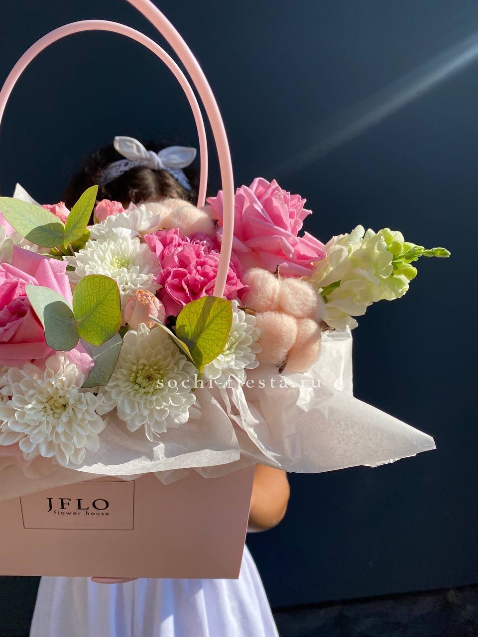 Белые розы и хризантемы сочетаются с воздушной эустомой и хлопком в сумочке. Светлая гамма с прохладным оттенком напоминает морскую свежесть и создает спокойное настроение.