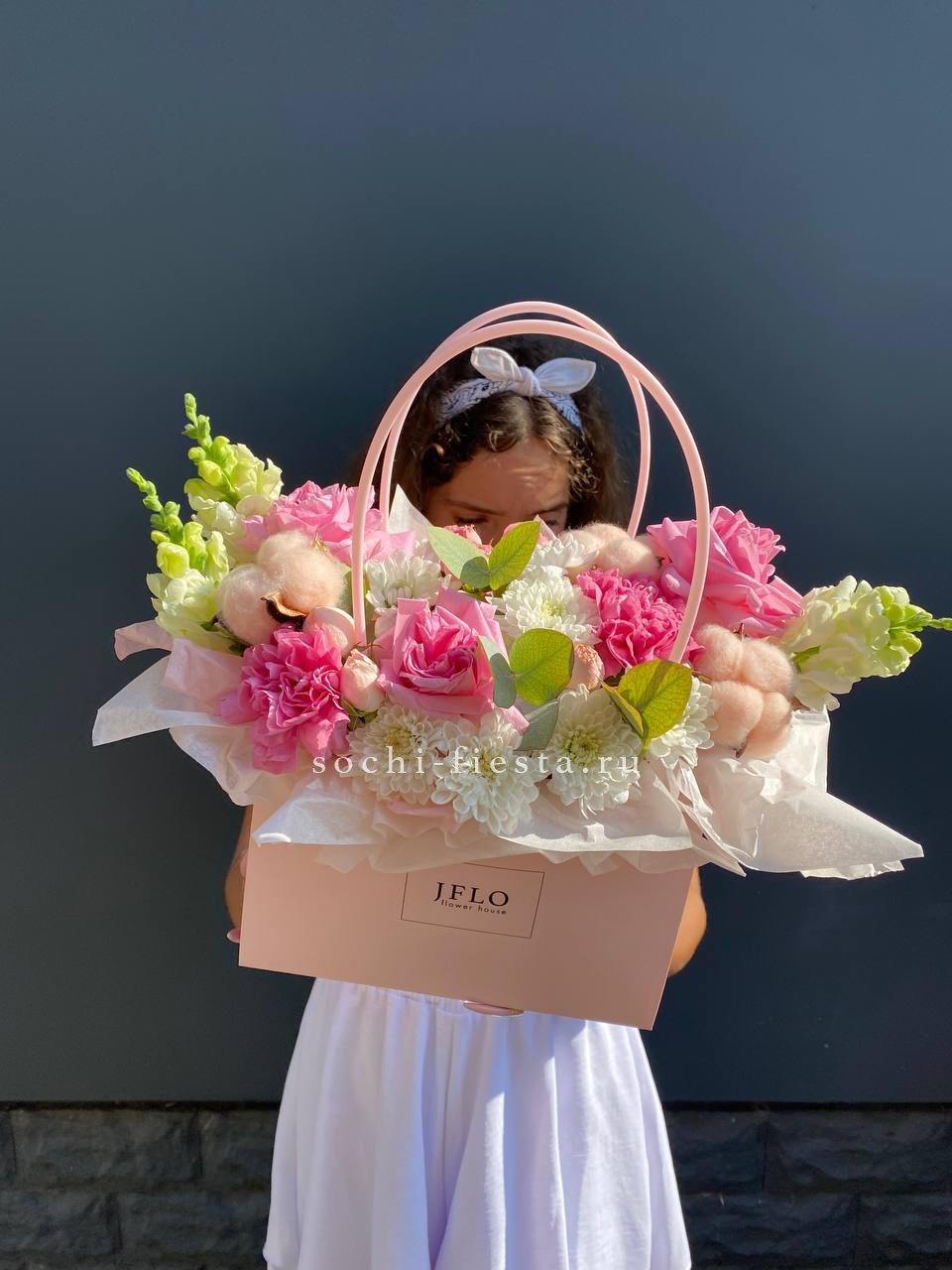 белая роза, хризантема, хлопок, эустома, антиринум, сумочка.