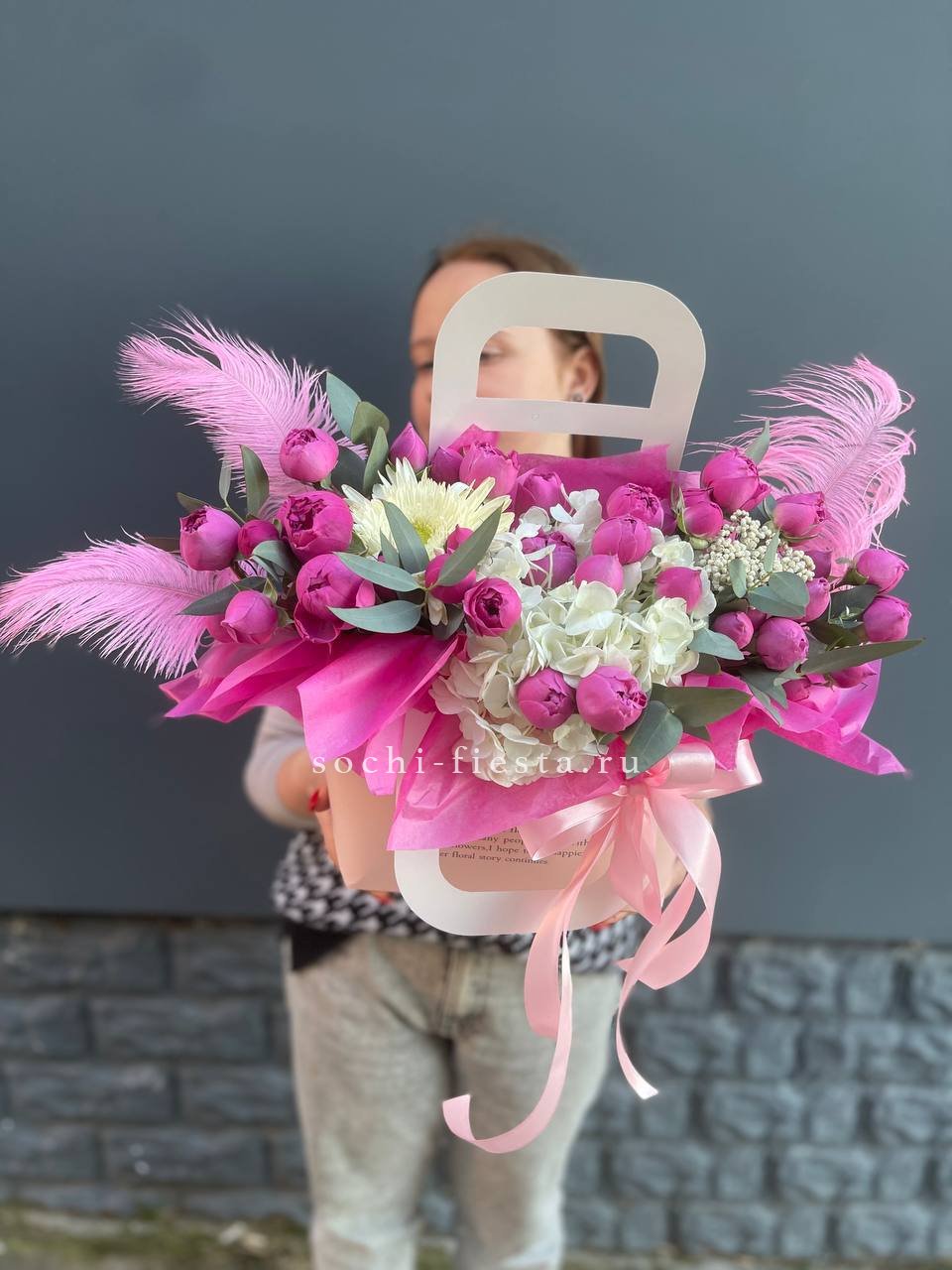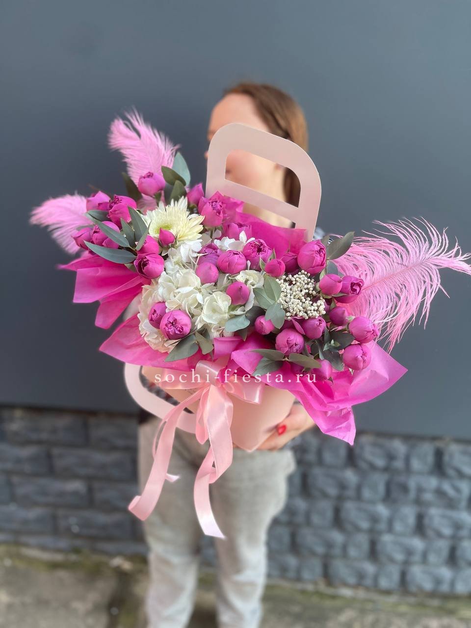 сумочка с гортензией, мисти баблс, герберой, озатамусом и эвкалиптом.