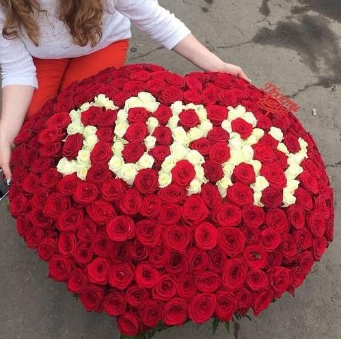 351 красная и белая роза, оформление в виде букета или в корзину на выбор. Надпись может быть изменена по желанию заказчика на слово длиною до 5 букв.
