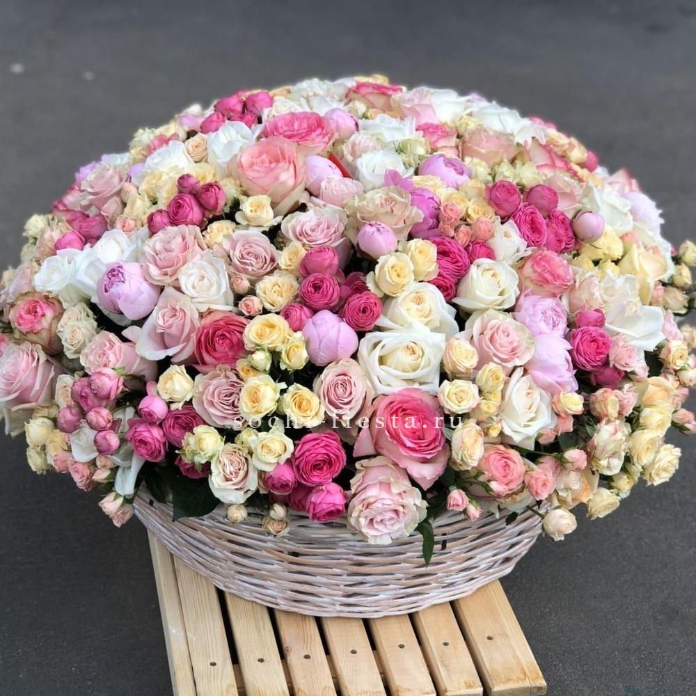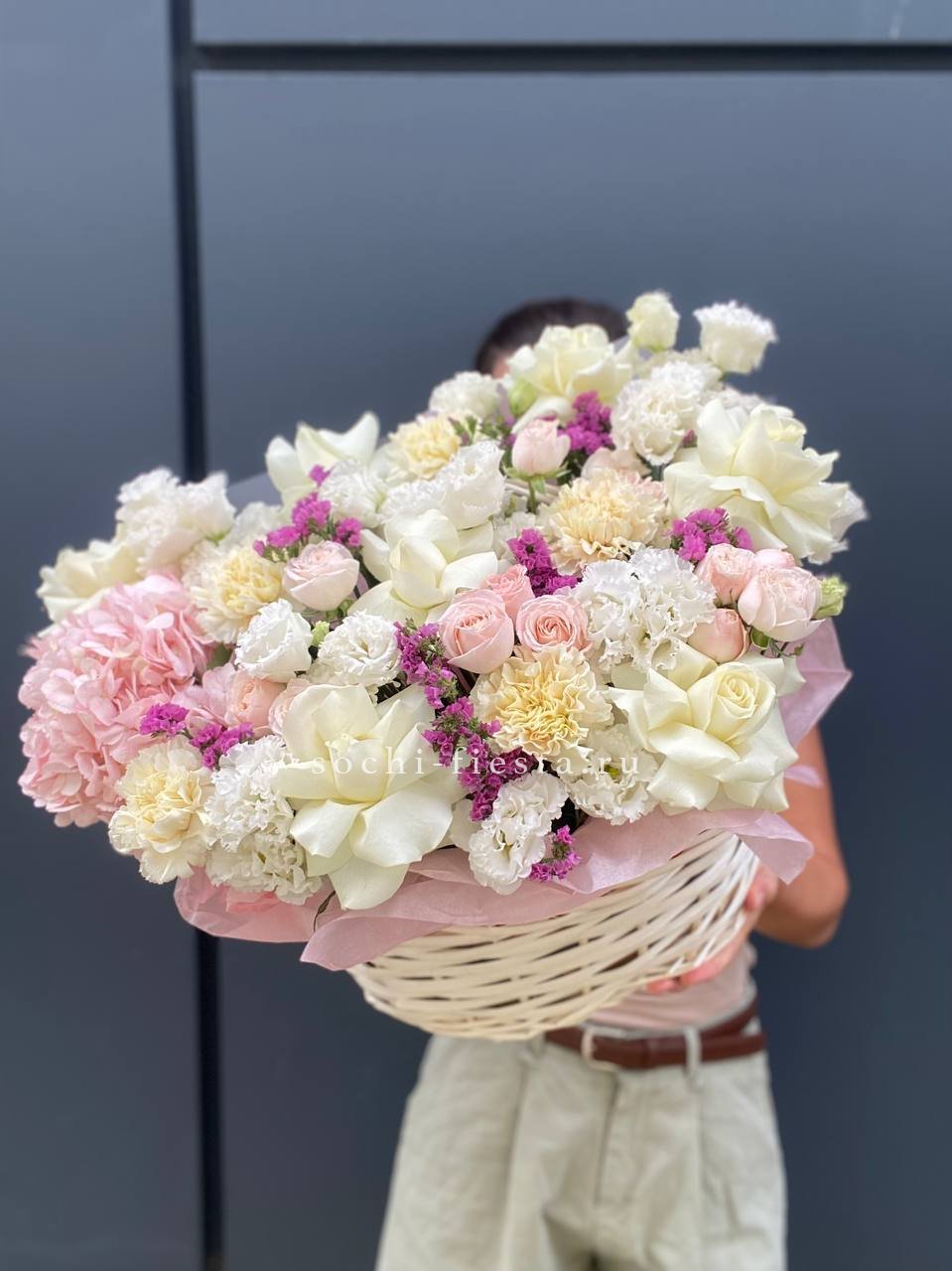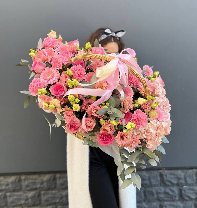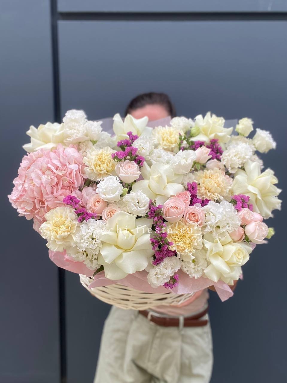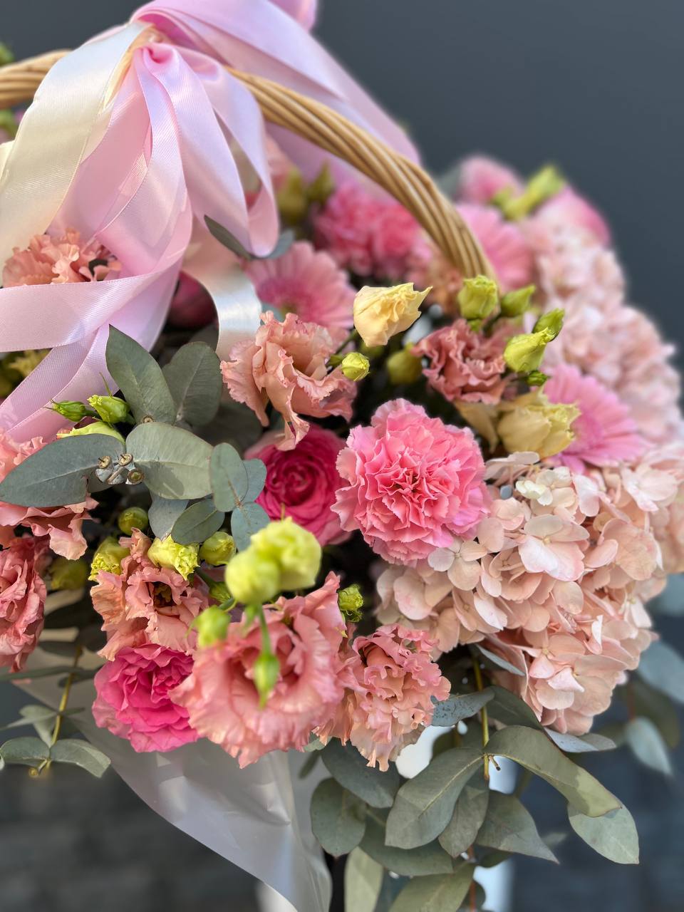 розы, эустома, гортензия, бомбастик, маттиола ( или аналог), эвкалипт, корзина.