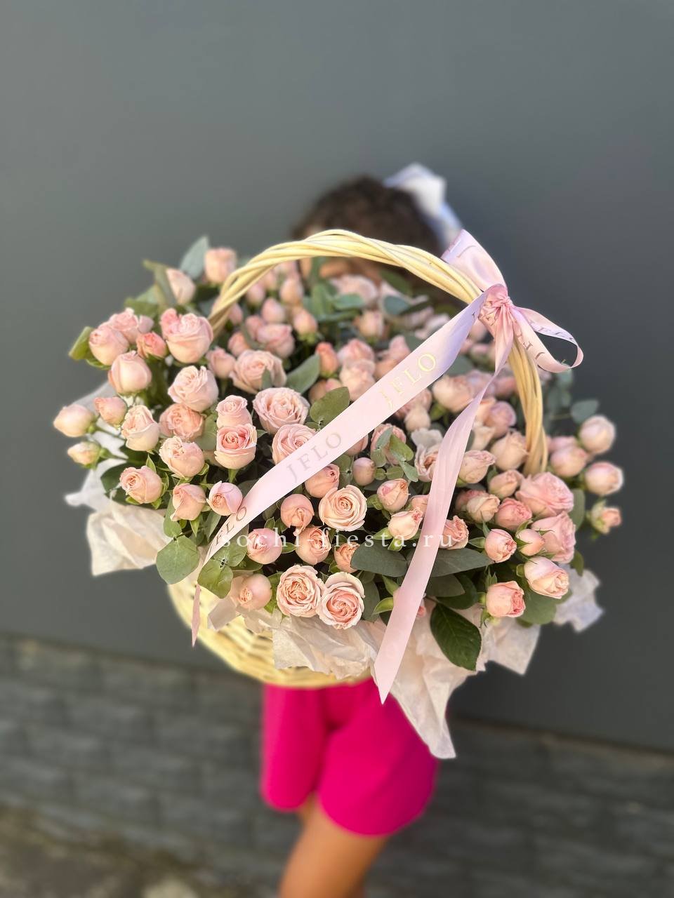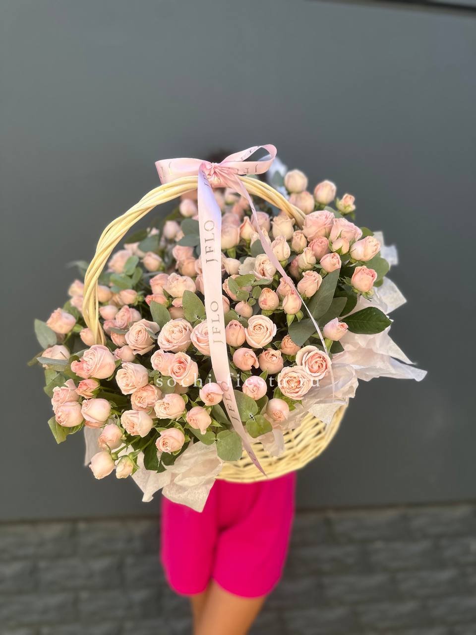 Пышная корзина с розами и гортензиями собрана плотно и объёмно. Маттиола добавляет живую текстуру между крупными соцветиями, а кустовые розы заполняют композицию мягкими переходами. Результат — впечатляющее присутствие, которое меняет восприятие пространства.