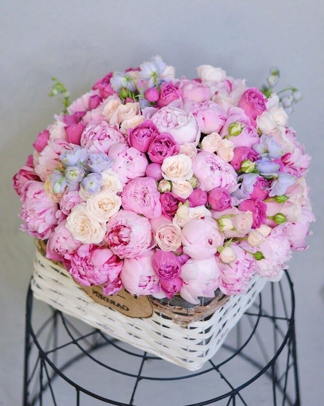 пионы, кустовая пионовидная роза, маттиола, пиафлор, плетеный бокс или корзина D40 В низкий сезон (с сентября - по апрель) пионы, находящиеся в составе данной композиции, могут быть заменены на пионовидную розу по согласованию с заказчиком.