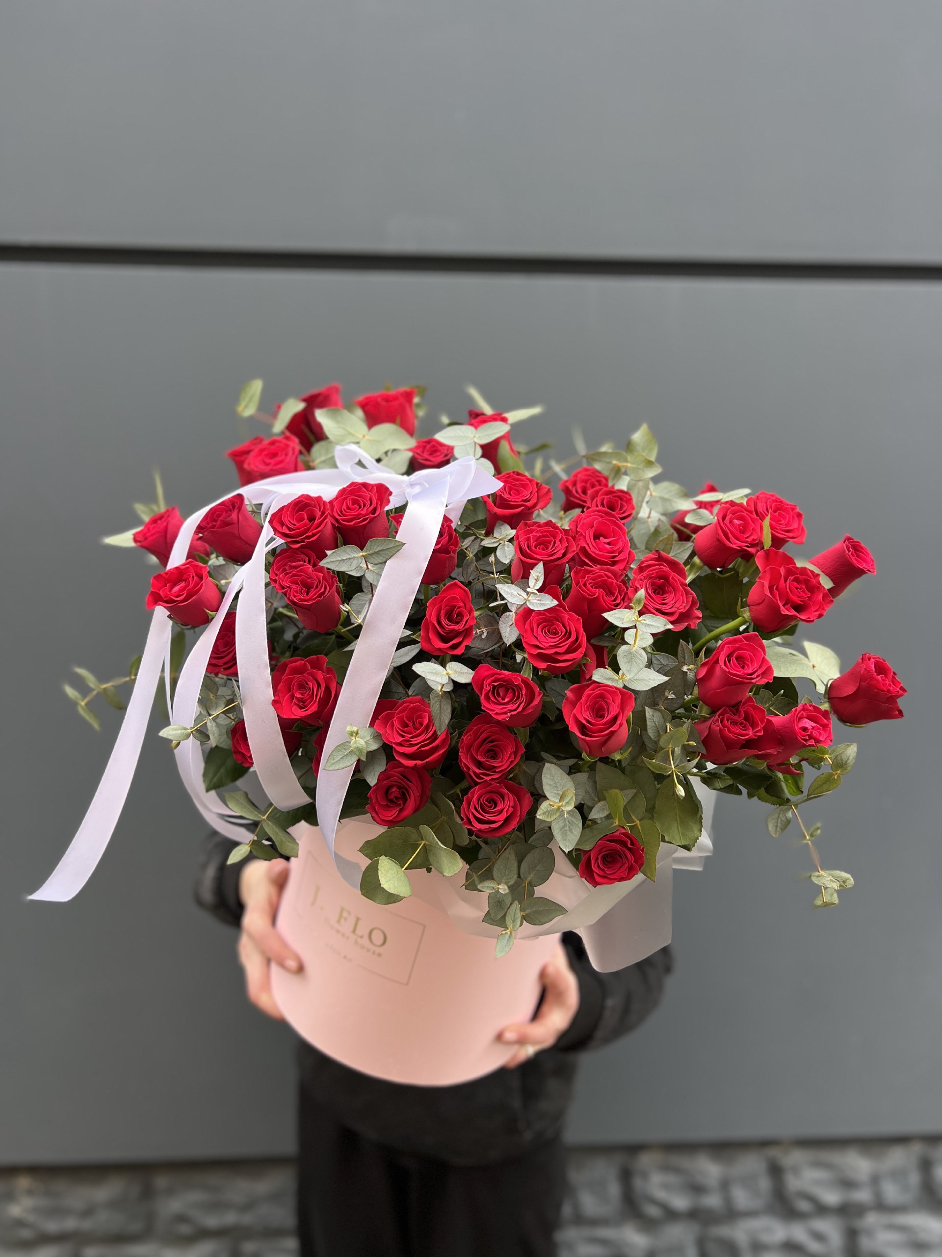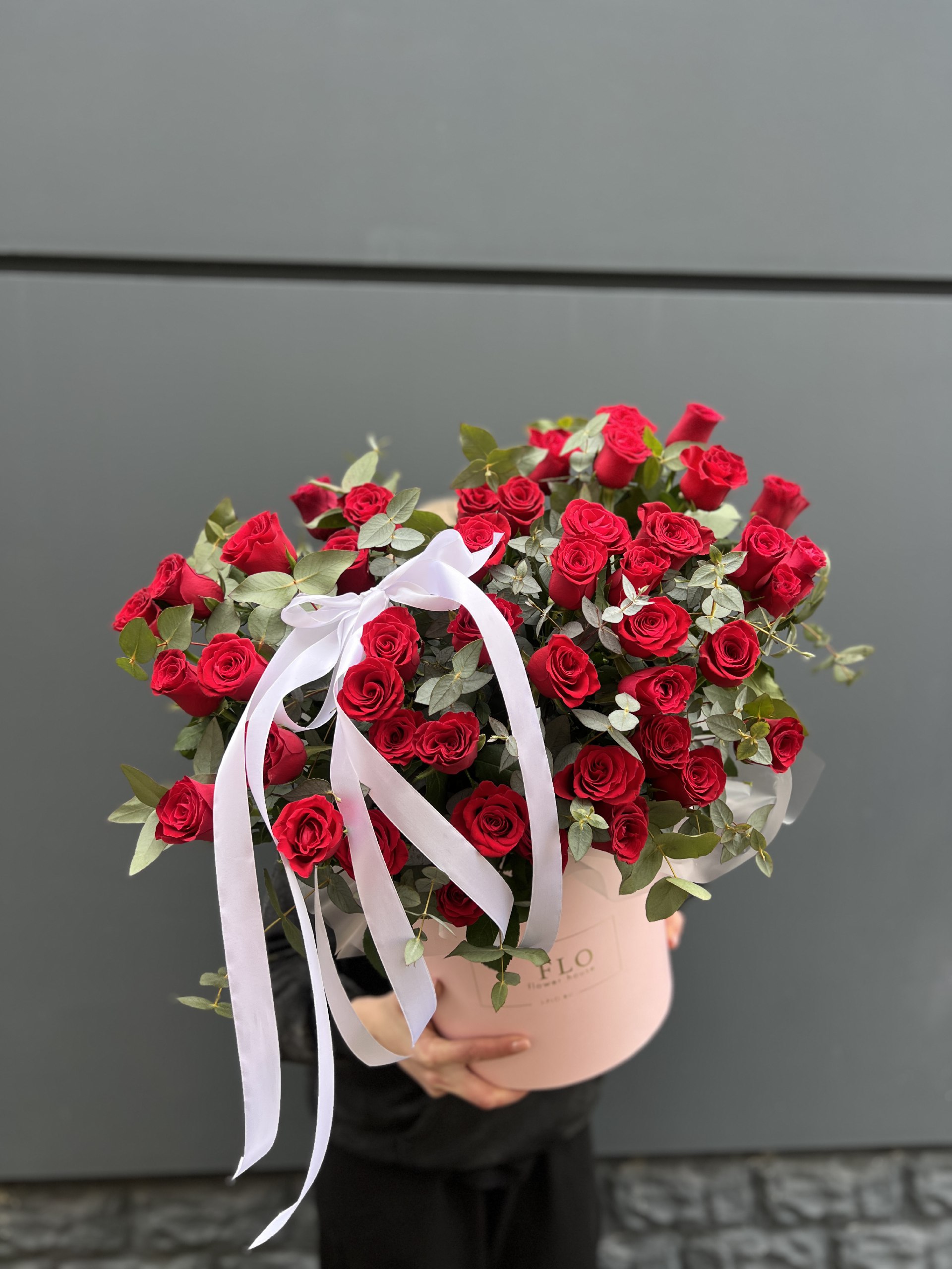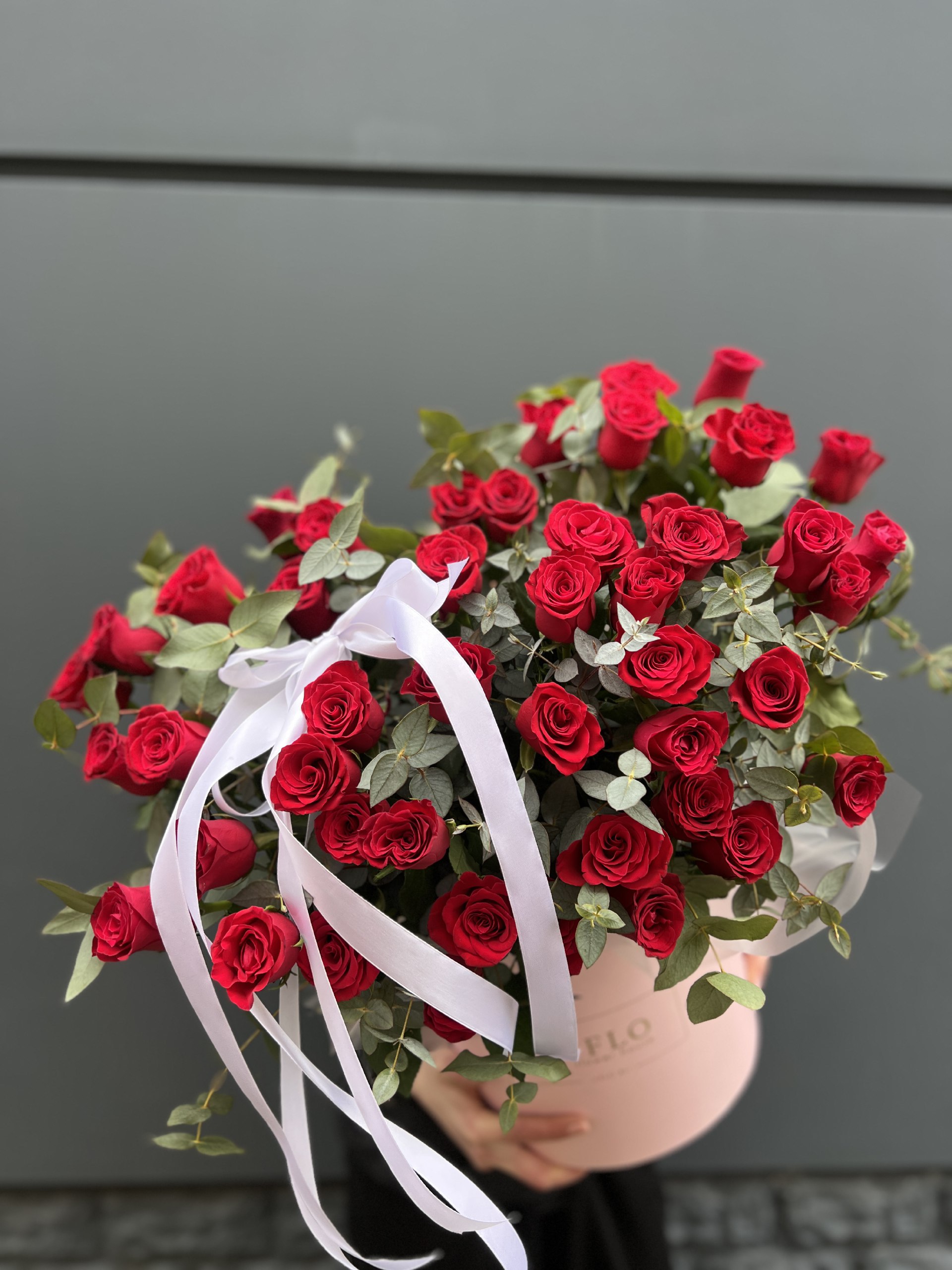 Сорок пять красных роз в высоком цилиндре создают впечатляющее присутствие. Плотная сборка держит форму, эвкалипт добавляет зелени по краю.