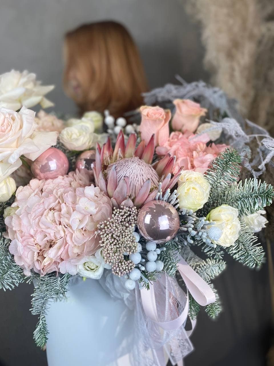 датский нобилис, гортензия, протея, хамелациум, пионовидные кустовые розы, аспарагус, эвкалипт, бруния, набор ёлочных украшений, цилиндр Готовая композиция может иметь незначительные внешние отличия от примера на фотографии, вместе с тем, сохранит гамму и фактуру.