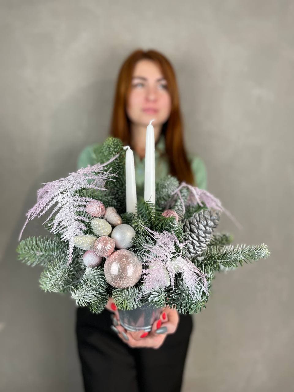датский нобилис, кашпо, оазис, свечи, новогодние игрушки, декор Готовая композиция может иметь незначительные внешние отличия от примера на фотографии.
