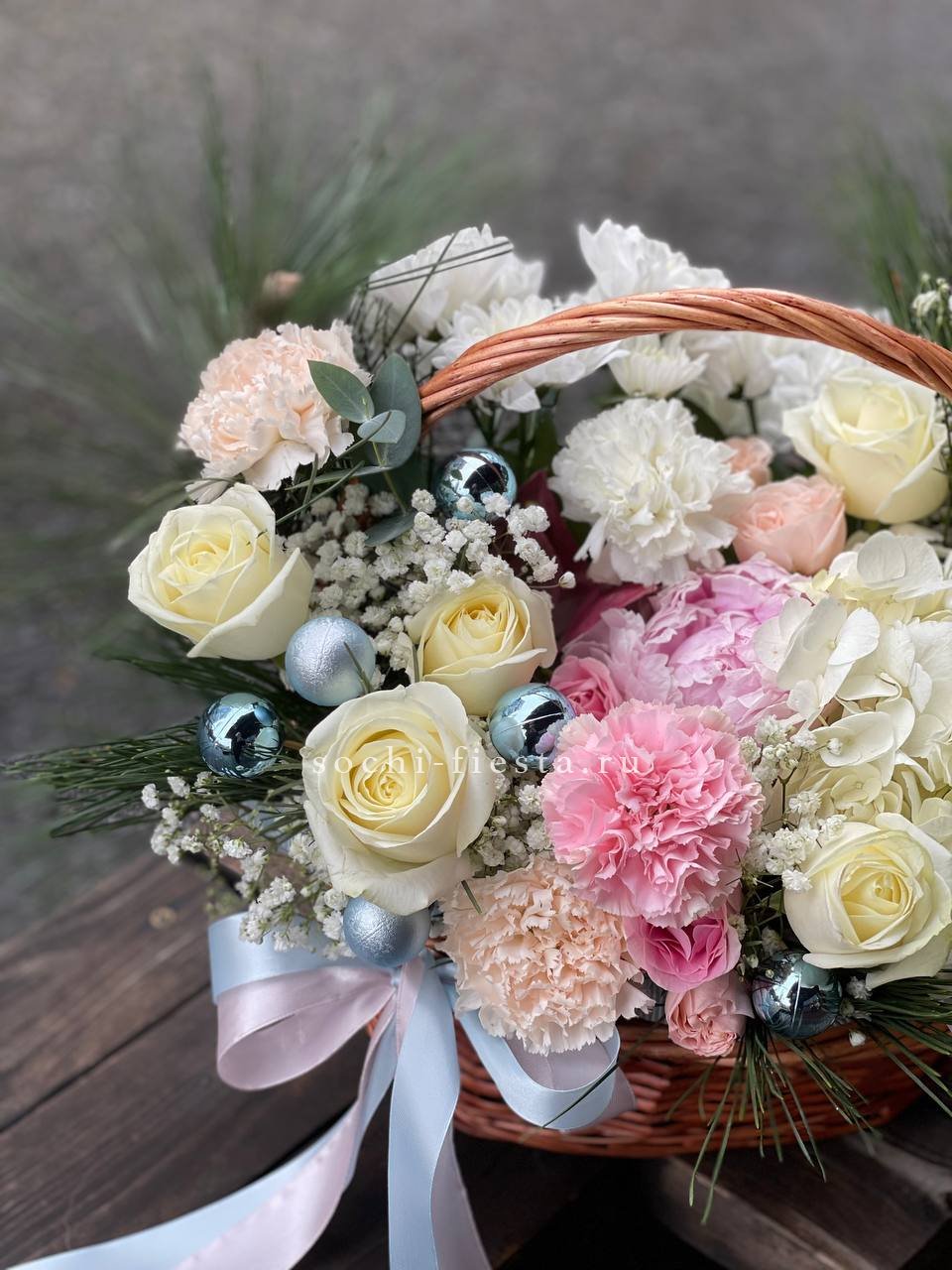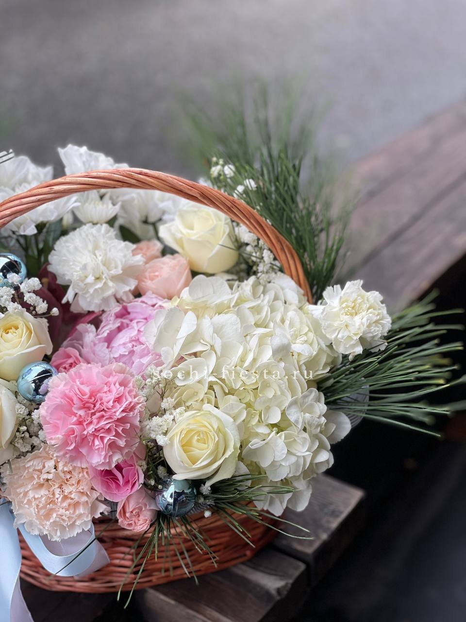 Праздничная корзина сочетает пышную гортензию с бархатистыми розами и яркими хризантемами. Еловые ветви и золотистый бомбастик создают объёмную текстуру, а диантусы и гипсофила добавляют воздушности композиции.