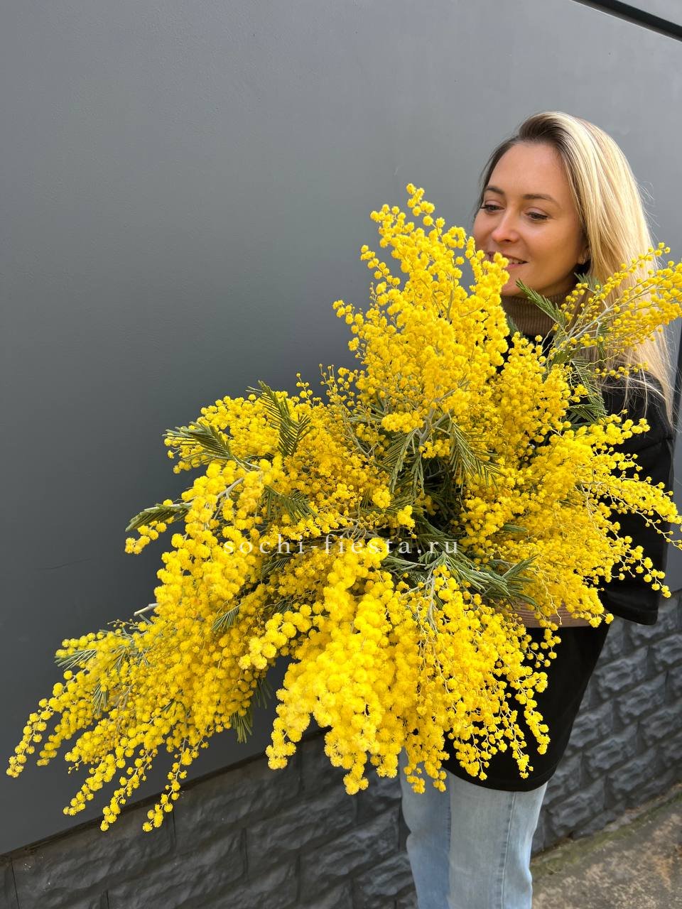 Девять веток мимозы собраны в пышную охапку, где золотистые шарики соцветий создают воздушное облако солнечного цвета. Простая лента фиксирует композицию, сохраняя естественную свободу весенних ветвей.