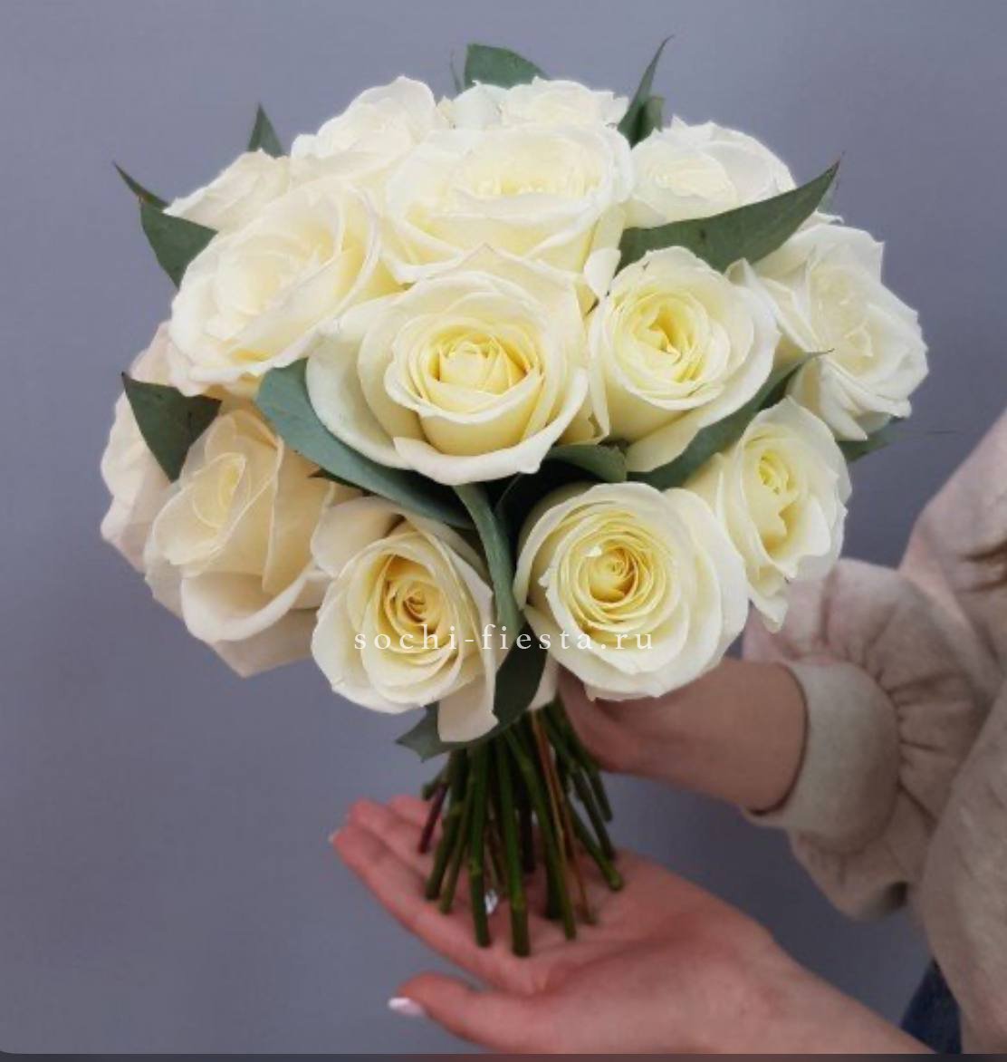 пионовидные розы Бомбастик, одноголовые розы, эвкалипт, лента.