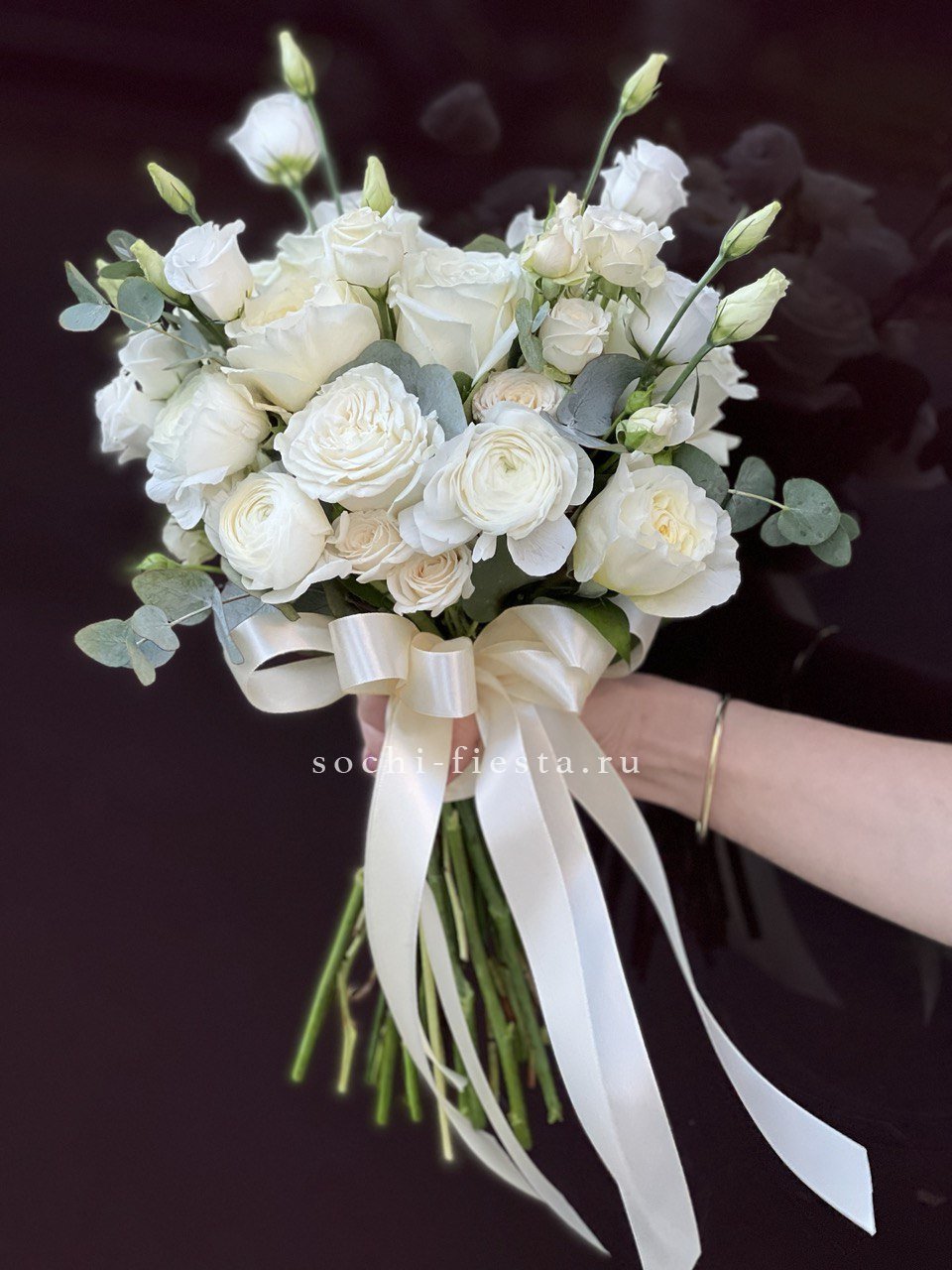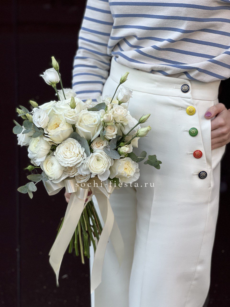 Двадцать один белоснежный диантус собран в округлую форму классического свадебного букета. Плотная структура и чистота линий подходят для церемонии.