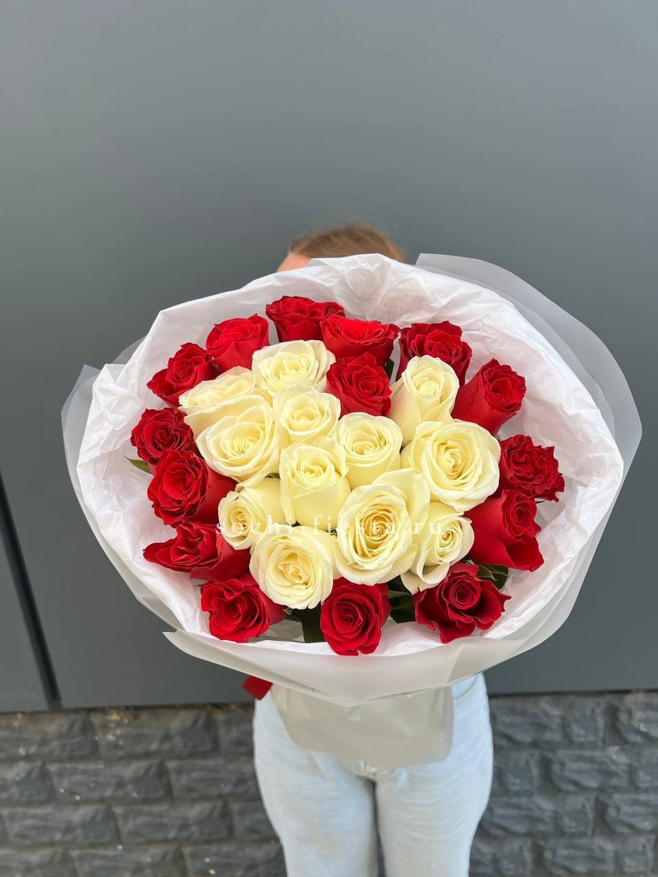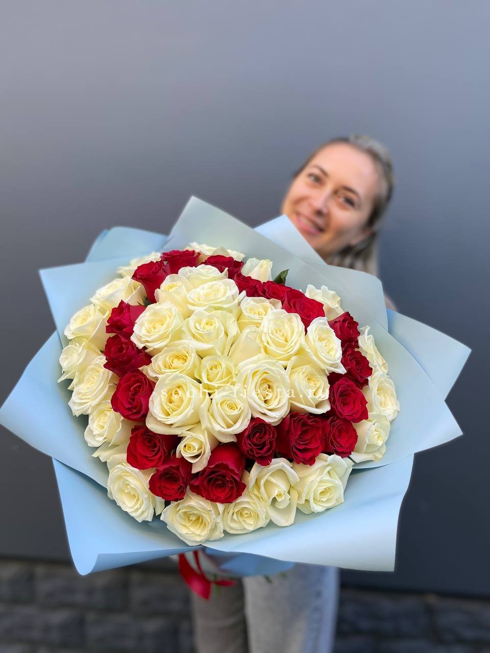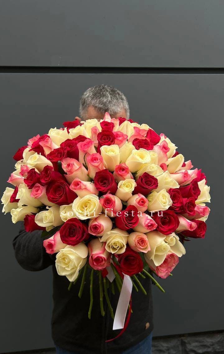 55 роз белого и розового оттенков или же с добавлением кремовой розы, лента, упаковка.