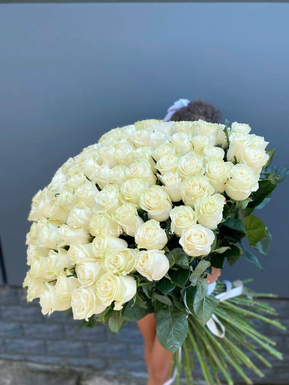 101 белая роза 90см, лента.